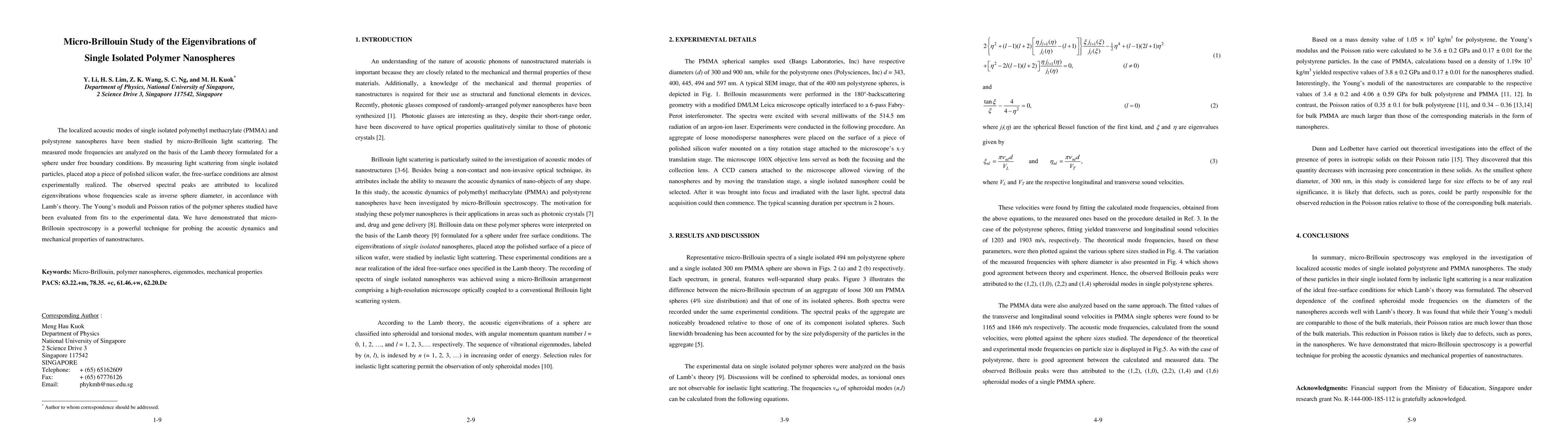 This study uses micro-Brillouin light scattering to investigate the localized acoustic modes of single isolated PMMA and polystyrene nanospheres, revealing eigenvibrations that scale inversely with sphere diameter. The research evaluates the Young's moduli and Poisson ratios of the polymers, demonstrating micro-Brillouin spectroscopy's effectiveness in probing nanostructure acoustic dynamics and mechanical properties.