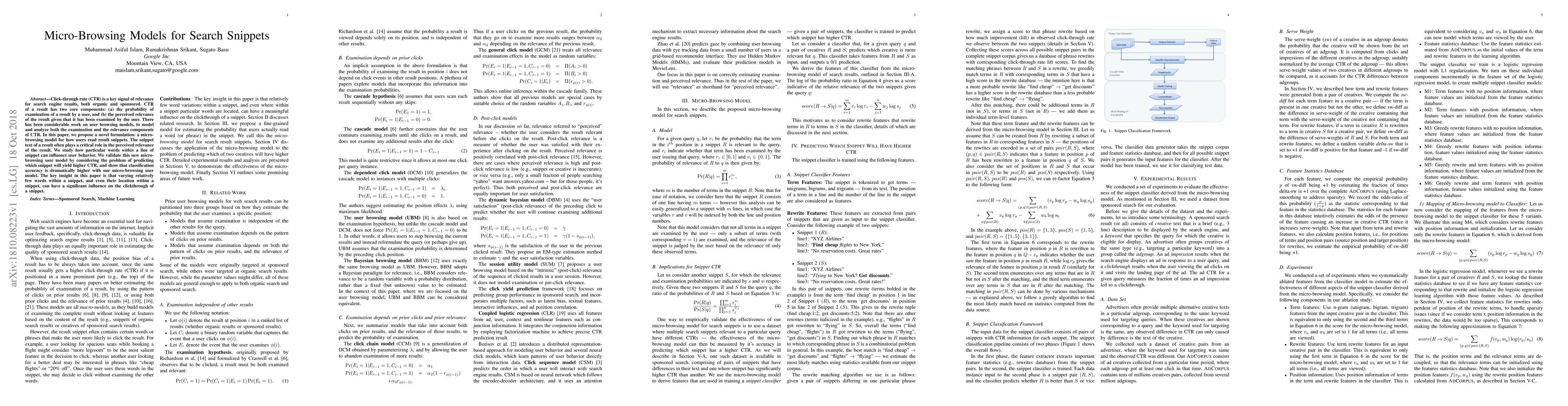 Researchers propose a micro-browsing model to predict click-through rates of search snippets based on how users read specific words within the snippet text. Their new approach improves classification accuracy dramatically compared to existing models.