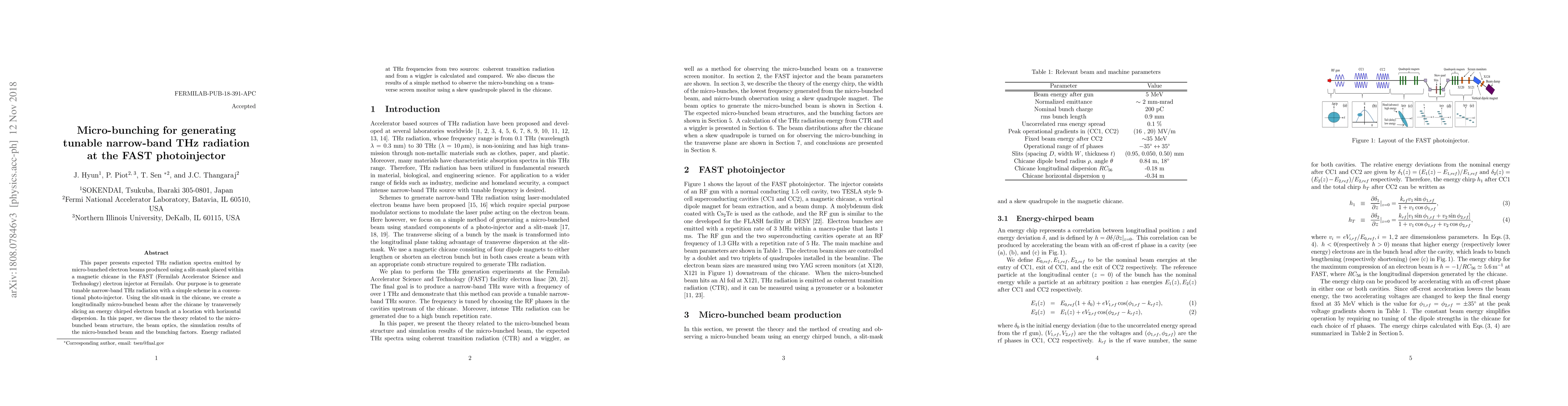 This paper explores the generation of tunable narrow-band THz radiation via micro-bunched electron beams in the FAST photoinjector at Fermilab, utilizing a slit-mask in a magnetic chicane. The study includes theoretical analysis of micro-bunching, simulation results, and methods for observing the micro-bunching effect.