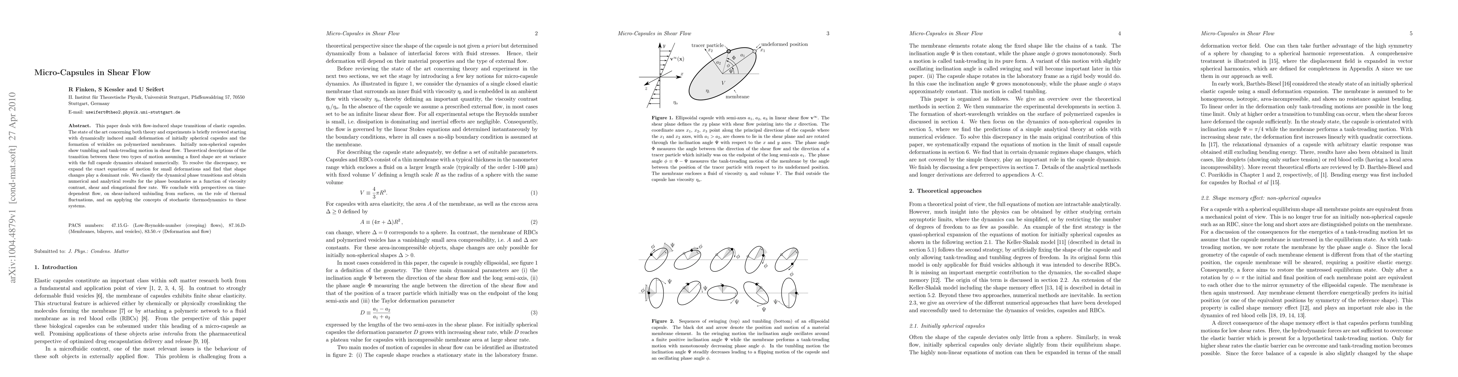 This paper investigates the flow-induced shape transitions of elastic micro-capsules in shear flow, revealing that dynamic shape changes significantly influence capsule motion, challenging existing theoretical models. The study provides numerical and analytical insights into phase transitions and boundary conditions based on viscosity contrast and flow rates.