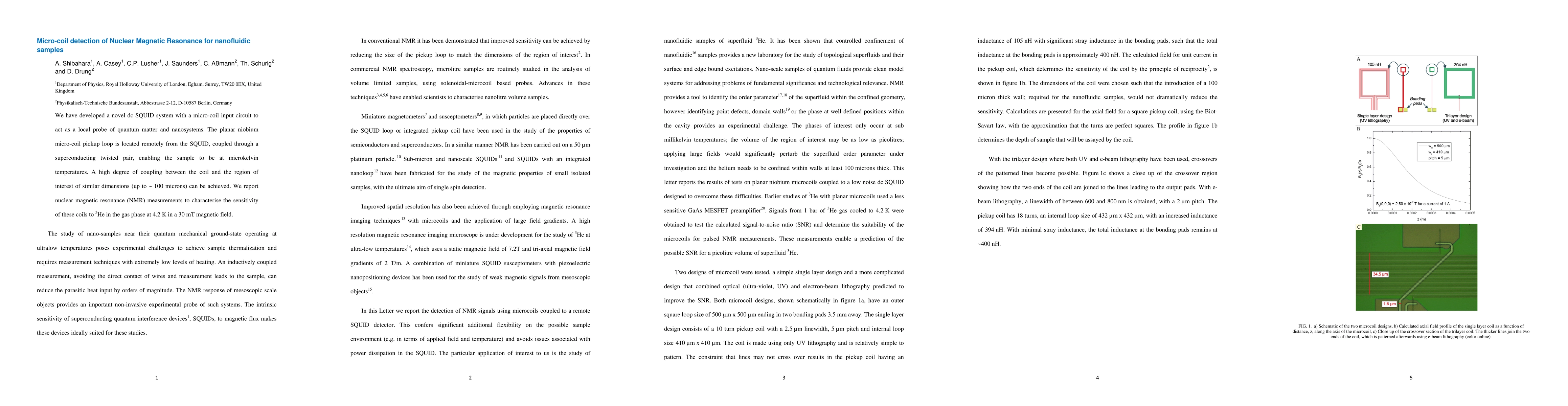 This paper introduces a novel dc SQUID system with a micro-coil input circuit for detecting nuclear magnetic resonance in nanofluidic samples. The micro-coil setup allows for high-sensitivity measurements at microkelvin temperatures, demonstrating its effectiveness in characterizing 3He gas phase NMR at 4.2 K.