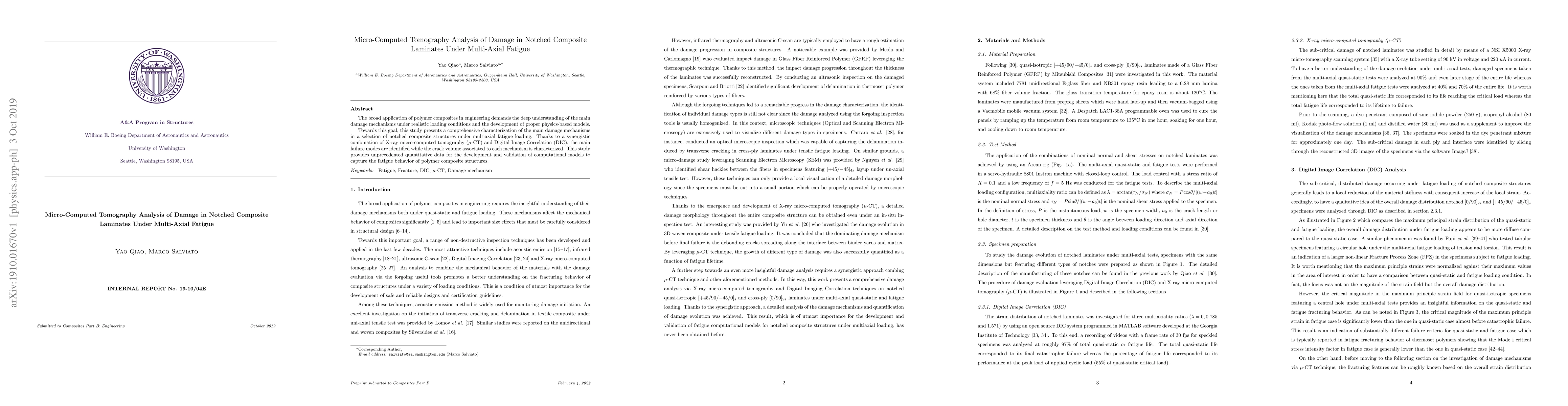 This study uses micro-computed tomography and Digital Image Correlation to characterize damage mechanisms in notched composite laminates under multiaxial fatigue, identifying main failure modes and quantifying crack volumes, providing data for computational model development.