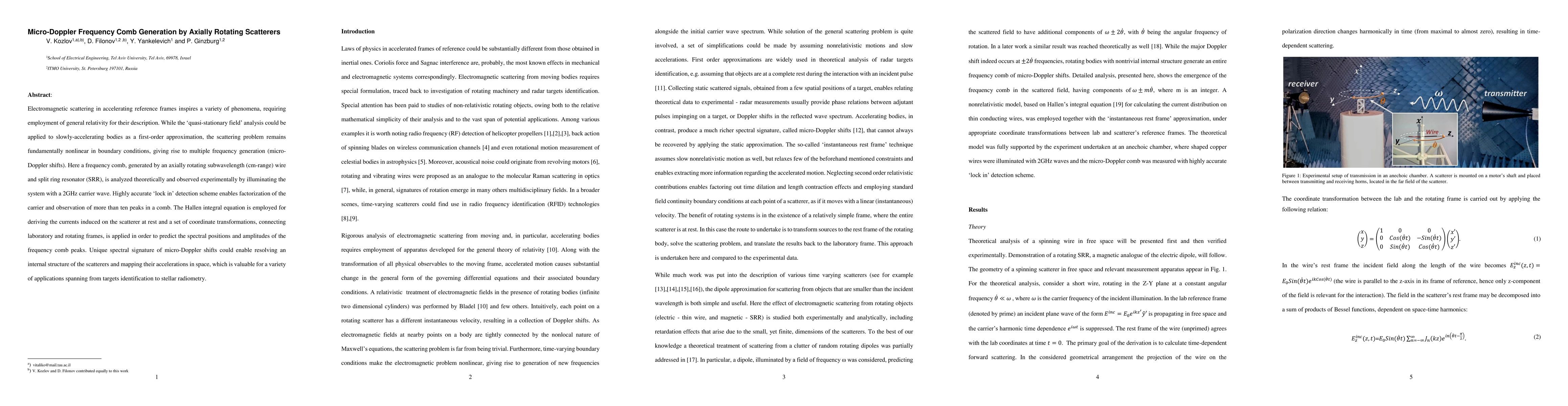 This paper investigates the generation of a micro-Doppler frequency comb via axially rotating scatterers, employing theoretical analysis and experimental validation with a 2GHz carrier wave. The study uses the Hallen integral equation and coordinate transformations to predict spectral positions, highlighting potential applications in target identification and stellar radiometry.