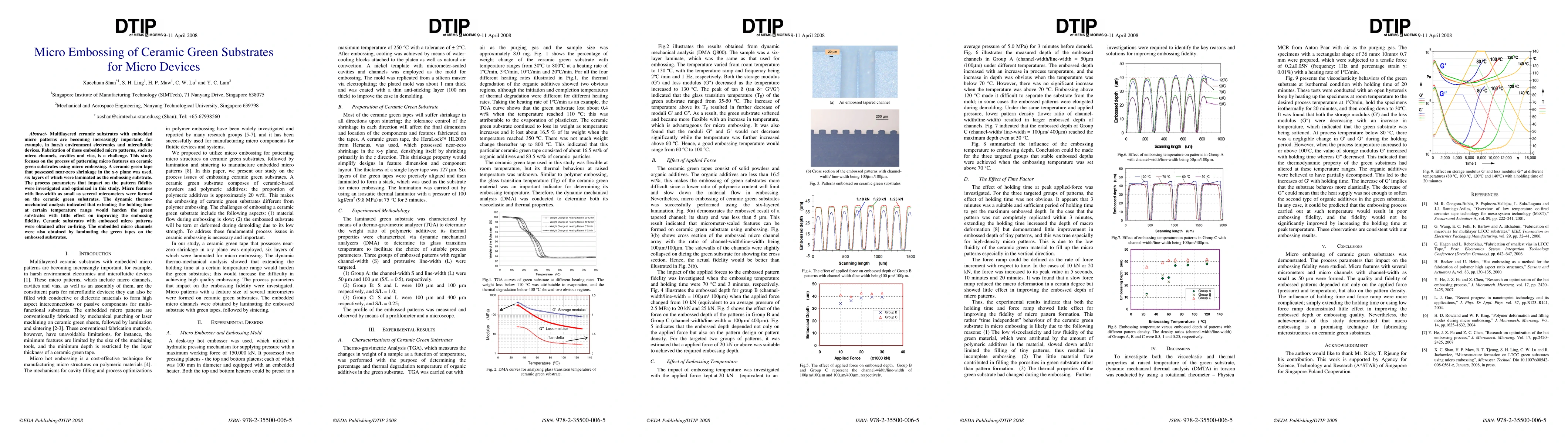 This study explores the micro embossing technique for creating micro features on ceramic green substrates, achieving patterns with line-widths of several micrometers. Optimization of process parameters improved pattern fidelity, with extended holding time during thermo-mechanical analysis enhancing substrate hardening without compromising embossing quality.