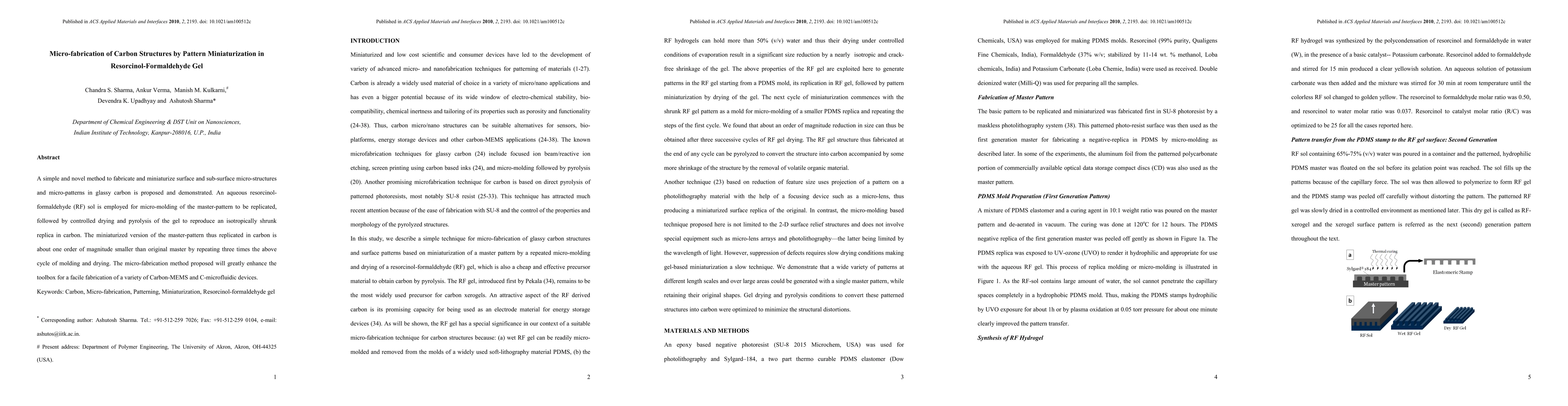 A simple and novel method to fabricate and miniaturize surface and sub-surface micro-structures and micro-patterns in glassy carbon is proposed and demonstrated. An aqueous resorcinol-formaldehyde (RF) sol is employed for micro-molding of the master-pattern to be replicated, followed by controlled drying and pyrolysis of the gel to reproduce an isotropically shrunk replica in carbon. The miniaturized version of the master-pattern thus replicated in carbon is about one order of magnitude smaller than original master by repeating three times the above cycle of molding and drying. The micro-fabrication method proposed will greatly enhance the toolbox for a facile fabrication of a variety of Carbon-MEMS and C-microfluidic devices.