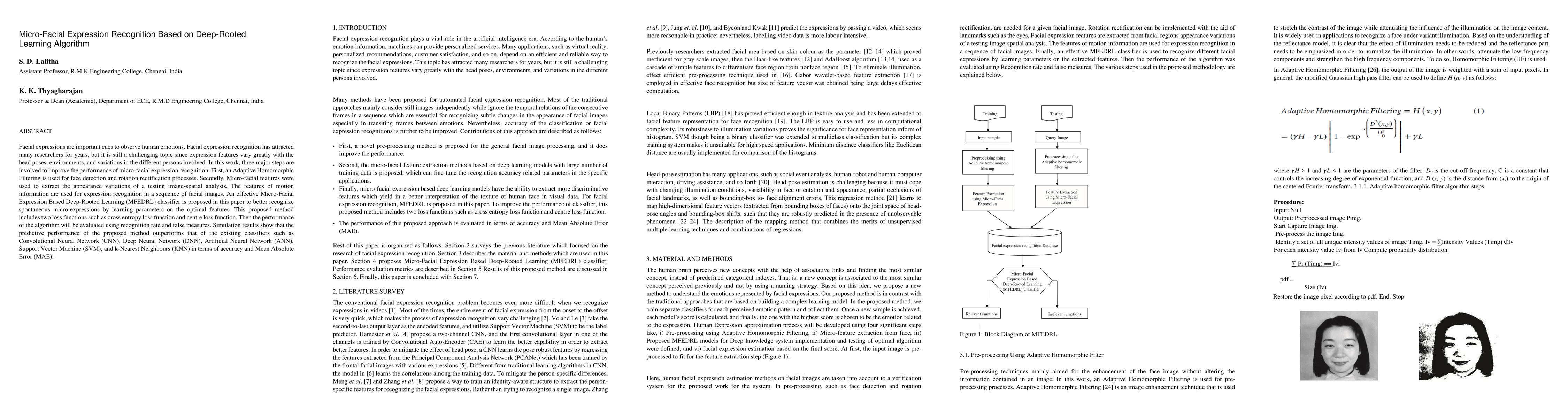 This paper proposes an Adaptive Homomorphic Filtering for face detection and rotation rectification, followed by Micro-Facial Expression Based Deep-Rooted Learning (MFEDRL) for recognizing micro-expressions using motion information. Simulation results show superior performance over existing classifiers in terms of accuracy and Mean Absolute Error.