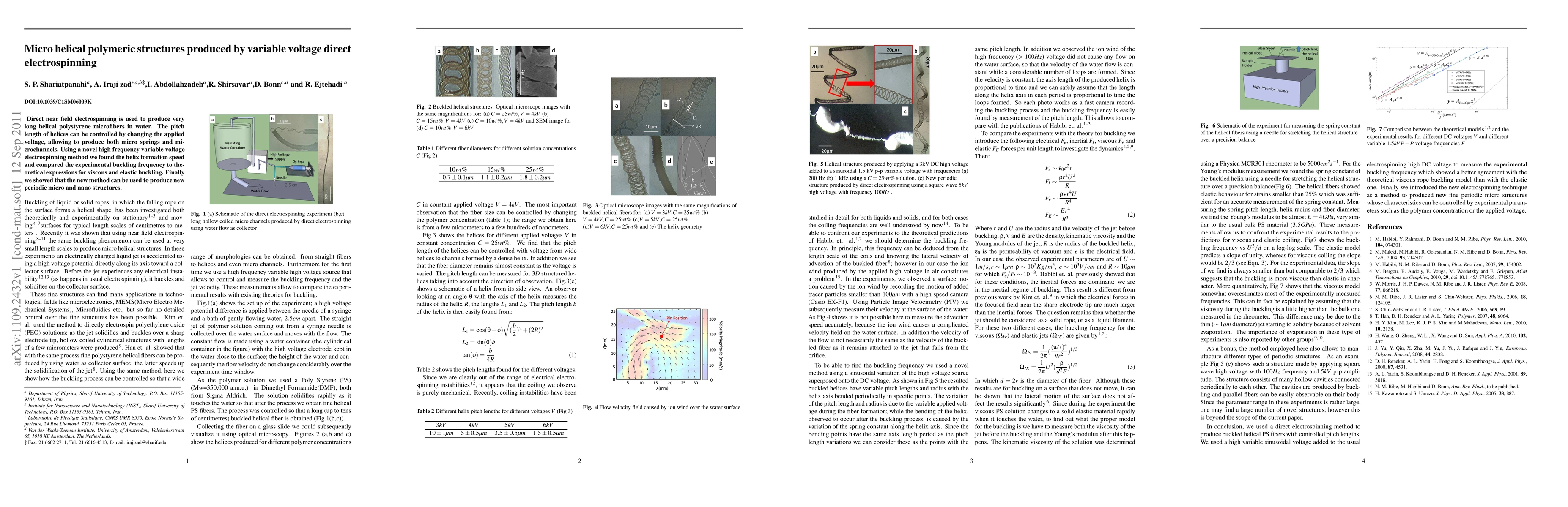 This paper details a novel electrospinning technique to produce long helical polystyrene microfibers in water, with pitch length controlled by applied voltage, enabling the creation of micro springs and microchannels. The study also compares experimental buckling frequency to theoretical models and demonstrates the potential for producing new periodic micro and nano structures.