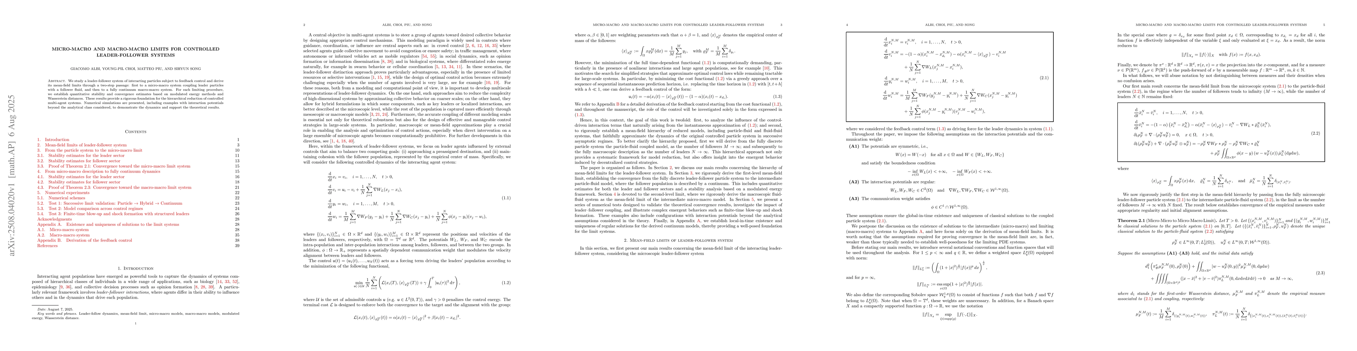 We study a leader-follower system of interacting particles subject to feedback control and derive its mean-field limits through a two-step passage: first to a micro-macro system coupling leader particles with a follower fluid, and then to a fully continuum macro-macro system. For each limiting procedure, we establish quantitative stability and convergence estimates based on modulated energy methods and Wasserstein distances. These results provide a rigorous foundation for the hierarchical reduction of controlled multi-agent systems. Numerical simulations are presented, including examples with interaction potentials beyond the analytical class considered, to demonstrate the dynamics and support the theoretical results.