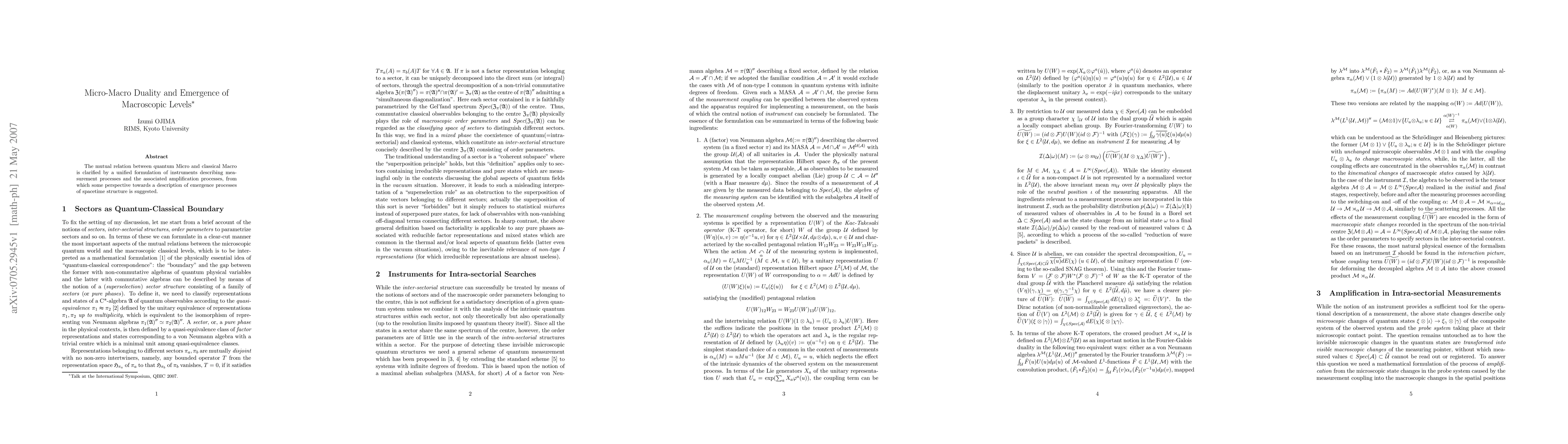 The mutual relation between quantum Micro and classical Macro is clarified by a unified formulation of instruments describing measurement processes and the associated amplification processes, from which some perspective towards a description of emergence processes of spacetime structure is suggested.