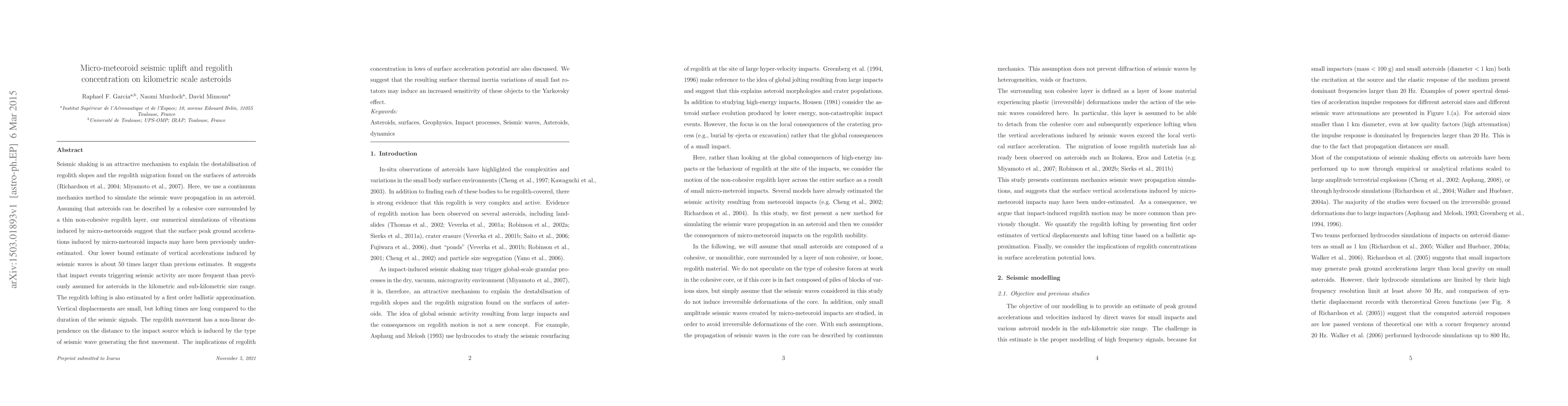 Seismic shaking is an attractive mechanism to explain the destabilisation of regolith slopes and the regolith migration found on the surfaces of asteroids (Richardson et al. 2004; Miyamoto et al. 2007). Here, we use a continuum mechanics method to simulate the seismic wave propagation in an asteroid. Assuming that asteroids can be described by a cohesive core surrounded by a thin non-cohesive regolith layer, our numerical simulations of vibrations induced by micro-meteoroids suggest that the surface peak ground accelerations induced by micro-meteoroid impacts may have been previously under-estimated. Our lower bound estimate of vertical accelerations induced by seismic waves is about 50 times larger than previous estimates. It suggests that impact events triggering seismic activity are more frequent than previously assumed for asteroids in the kilometric and sub-kilometric size range. The regolith lofting is also estimated by a first order ballistic approximation. Vertical displacements are small, but lofting times are long compared to the duration of the seismic signals. The regolith movement has a non-linear dependence on the distance to the impact source which is induced by the type of seismic wave generating the first movement. The implications of regolith concentration in lows of surface acceleration potential are also discussed. We suggest that the resulting surface thermal inertia variations of small fast rotators may induce an increased sensitivity of these objects to the Yarkovsky effect.