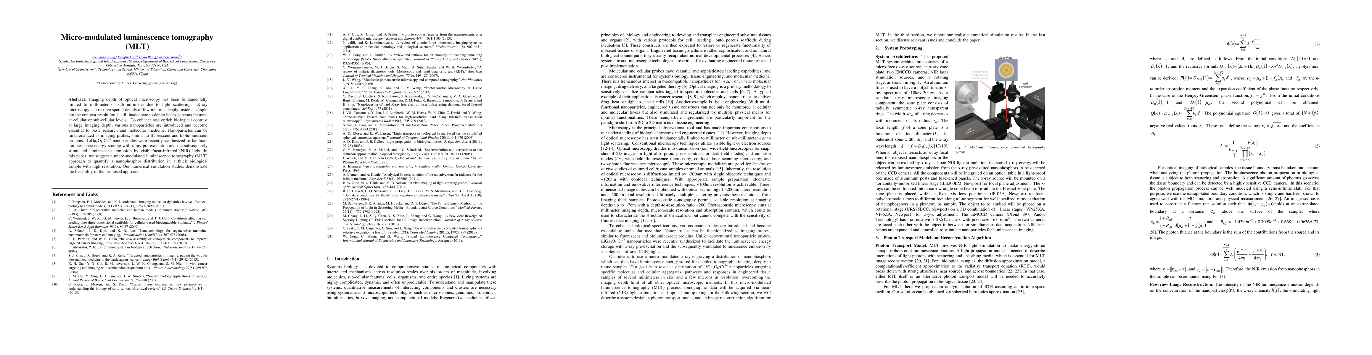 The main technical contribution of this research is the development of an MLT system architecture and photon transport model for high-resolution nanophosphor distribution imaging in thick biological samples using micro-modulated x-ray engraving and NIR light stimulation.