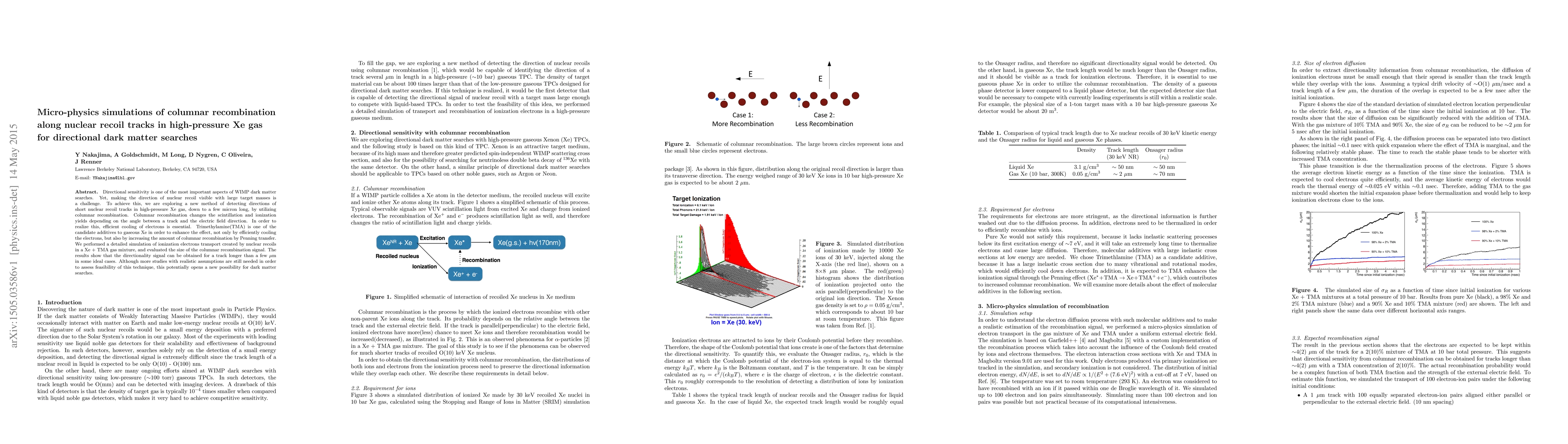 This paper explores the use of columnar recombination in high-pressure Xe gas to detect the direction of nuclear recoil tracks for directional dark matter searches, utilizing trimethylamine to enhance electron cooling and recombination. Simulations indicate potential for obtaining directionality signals for tracks longer than a few micrometers, though further studies are required to assess feasibility.
