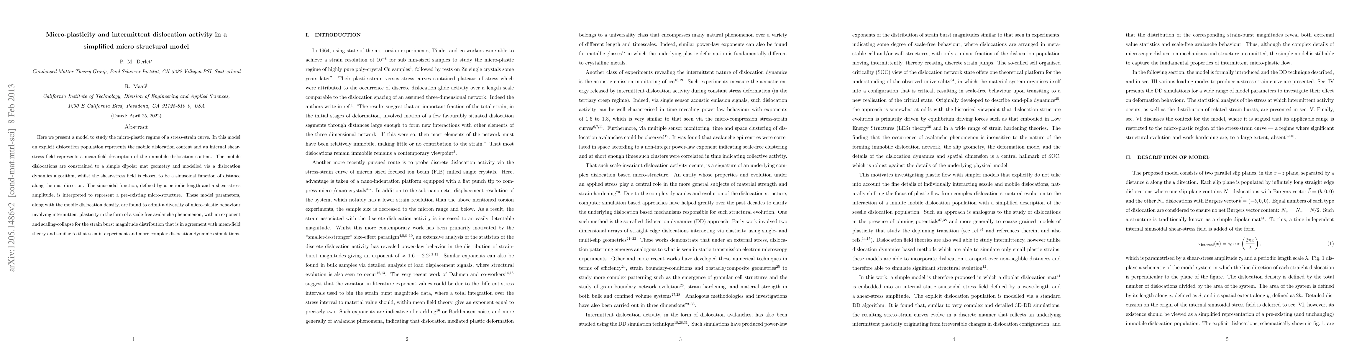 A simplified micro structural model simulates intermittent plasticity in metals, exhibiting scale-free avalanche phenomena with strain burst magnitude distributions similar to experiments and complex dislocation dynamics simulations. The model's parameters allow for diverse micro-plastic behavior.