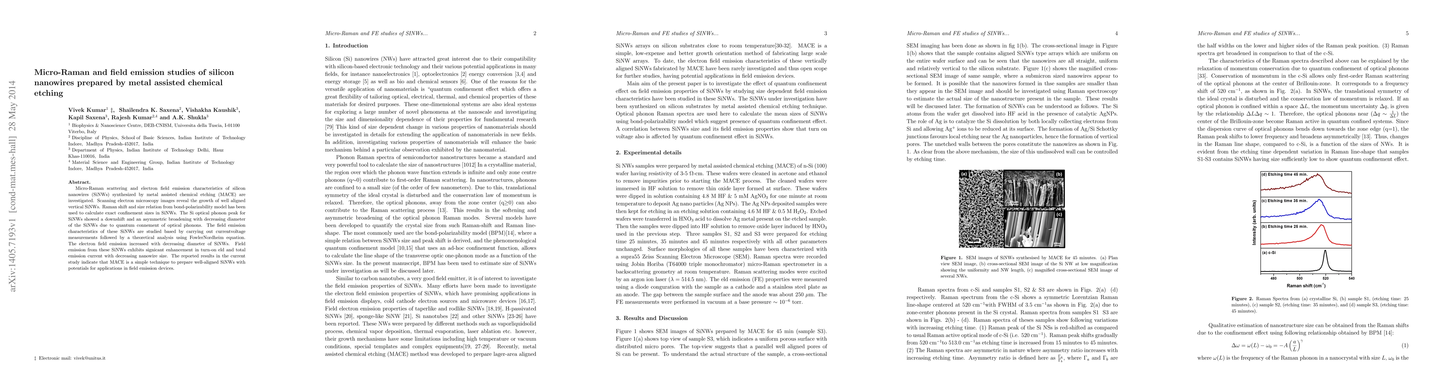 This study investigates silicon nanowires (SiNWs) synthesized via metal-assisted chemical etching (MACE) using micro-Raman and field emission techniques. The research finds that SiNWs exhibit quantum confinement effects, with optical phonon peaks shifting and broadening as diameter decreases, and enhanced field emission characteristics with smaller nanowire sizes.