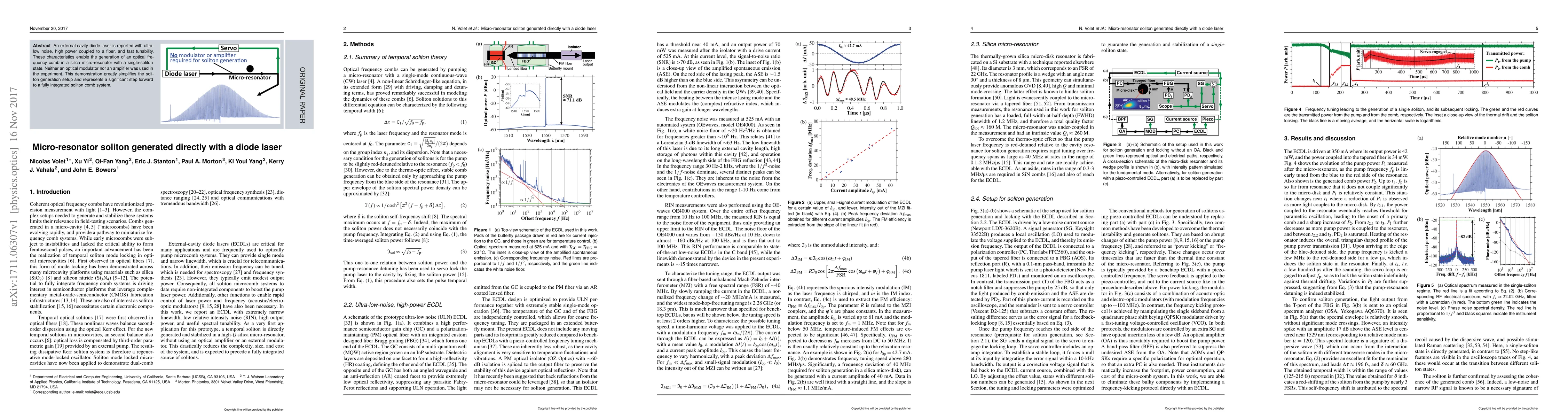 Summary: An external-cavity diode laser with ultralow noise and high power was used to generate a single-soliton optical frequency comb in a silica micro-resonator, simplifying soliton generation without the need for an optical modulator or amplifier. This advancement moves toward fully integrated soliton comb systems.