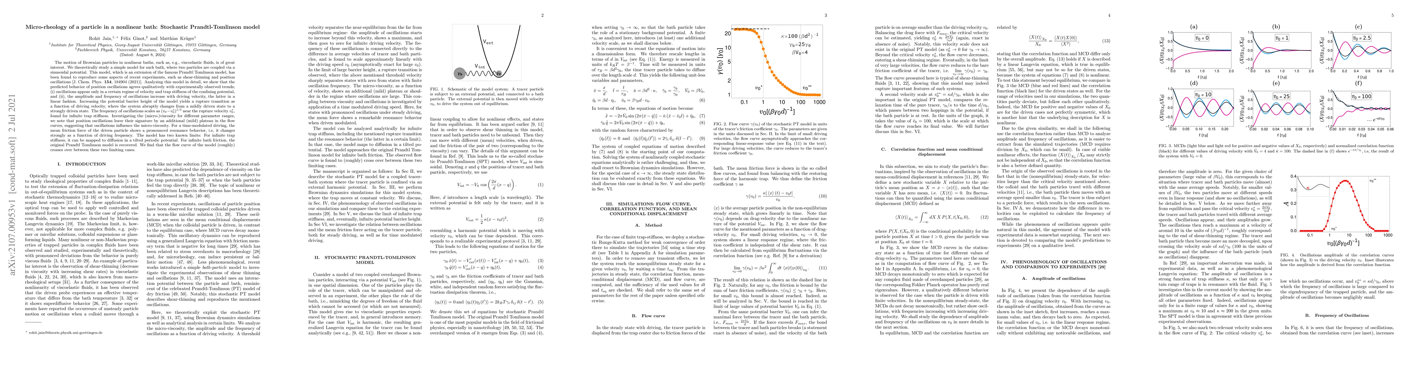 The motion of Brownian particles in nonlinear baths, such as, e.g., viscoelastic fluids, is of great interest. We theoretically study a simple model for such bath, where two particles are coupled via a sinusoidal potential. This model, which is an extension of the famous Prandtl Tomlinson model, has been found to reproduce some aspects of recent experiments, such as shear-thinning and position oscillations [J. Chem. Phys. {\bf 154}, 184904 (2021)]. Analyzing this model in detail, we show that the predicted behavior of position oscillations agrees qualitatively with experimentally observed trends; (i) oscillations appear only in a certain regime of velocity and trap stiffness of the confining potential, and (ii), the amplitude and frequency of oscillations increase with driving velocity, the latter in a linear fashion. Increasing the potential barrier height of the model yields a rupture transition as a function of driving velocity, where the system abruptly changes from a mildly driven state to a strongly driven state. The frequency of oscillations scales as $(v_0-v_0^*)^{1/2}$ near the rupture velocity $v_0^*$, found for infinite trap stiffness. Investigating the (micro-)viscosity for different parameter ranges, we note that position oscillations leave their signature by an additional (mild) plateau in the flow curves, suggesting that oscillations influence the micro-viscosity. For a time-modulated driving, the mean friction force of the driven particle shows a pronounced resonance behavior, i.e, it changes strongly as a function of driving frequency. The model has two known limits: For infinite trap stiffness, it can be mapped to diffusion in a tilted periodic potential. For infinite bath friction, the original Prandtl Tomlinson model is recovered. We find that the flow curve of the model (roughly) crosses over between these two limiting cases.