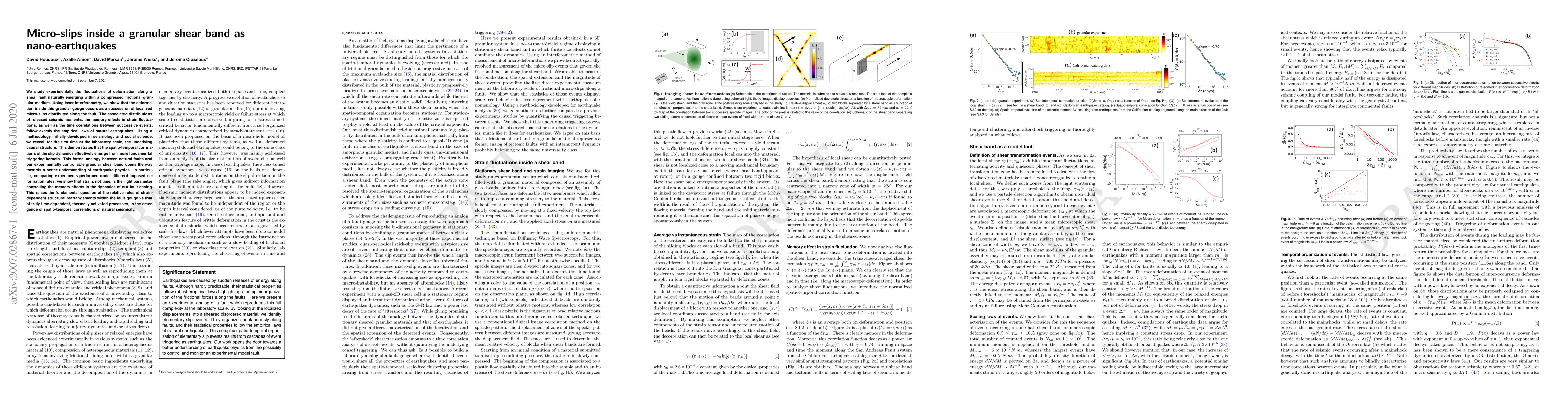 This study experimentally investigates micro-slips within a granular shear band using laser interferometry, revealing that they mimic the characteristics of natural earthquakes. The findings suggest that strain, rather than time, governs the memory effects in the fault dynamics, prompting deeper inquiry into the mechanisms behind seismicity.