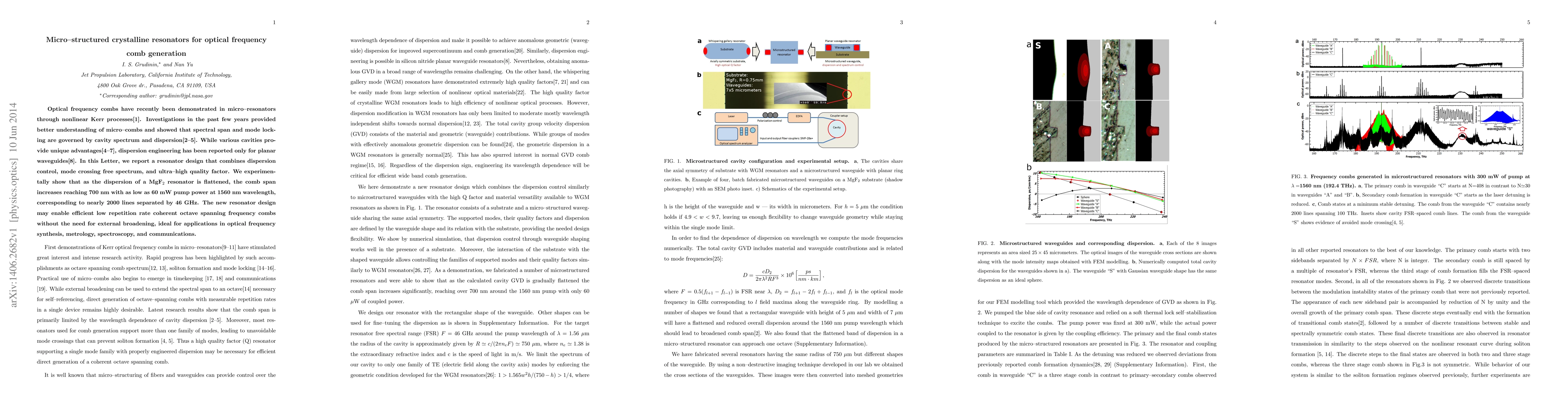 This paper presents a novel micro-structured crystalline resonator design that achieves a dispersion-controlled, mode-crossing-free optical frequency comb with a spectral span of 700 nm using minimal pump power. The new design enables efficient, low repetition rate, coherent octave-spanning frequency combs, ideal for optical frequency synthesis, metrology, spectroscopy, and communications.