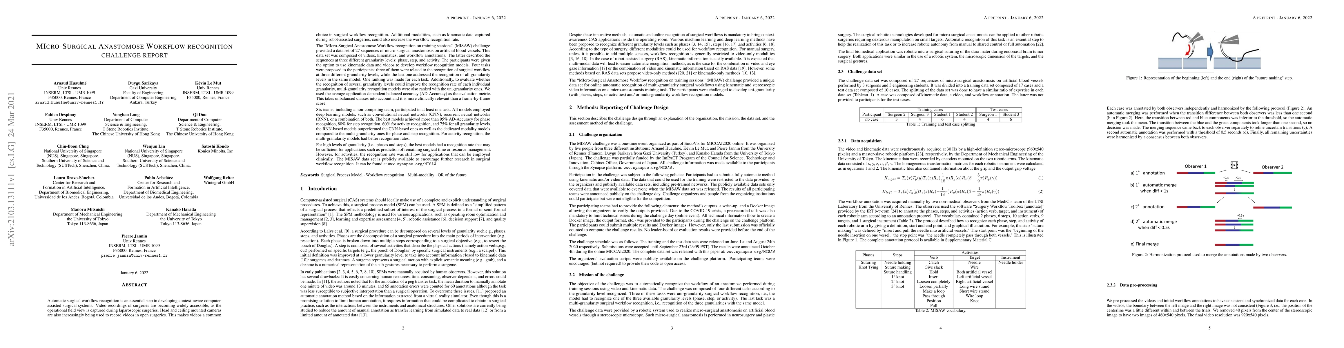 The MISAW challenge aimed to develop models for recognizing surgical workflow in micro-surgical anastomosis using a dataset of 27 video sequences. Participants utilized deep learning techniques to achieve high accuracy in phase and step recognition, but lower accuracy in activity recognition. The dataset is publicly available to foster further advancements in this field. For more details, visit www.synapse.org/MISAW.