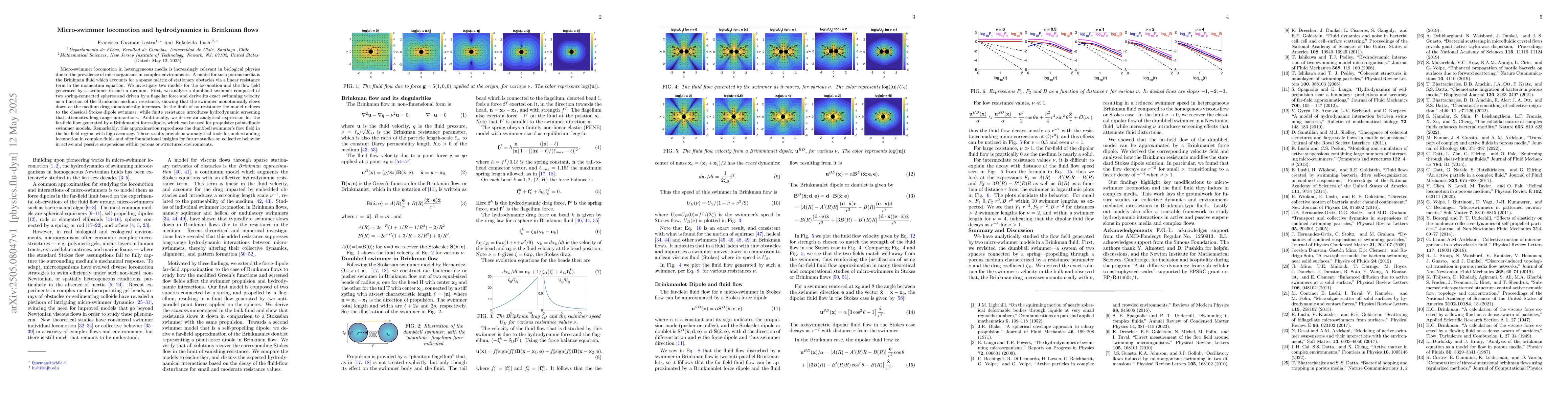 Researchers studied micro-swimmer locomotion in a Brinkman flow, a fluid model for complex environments, and found that the swimmer slows down as the medium drag increases, while an analytical expression reproduces its far-field flow field with high accuracy.