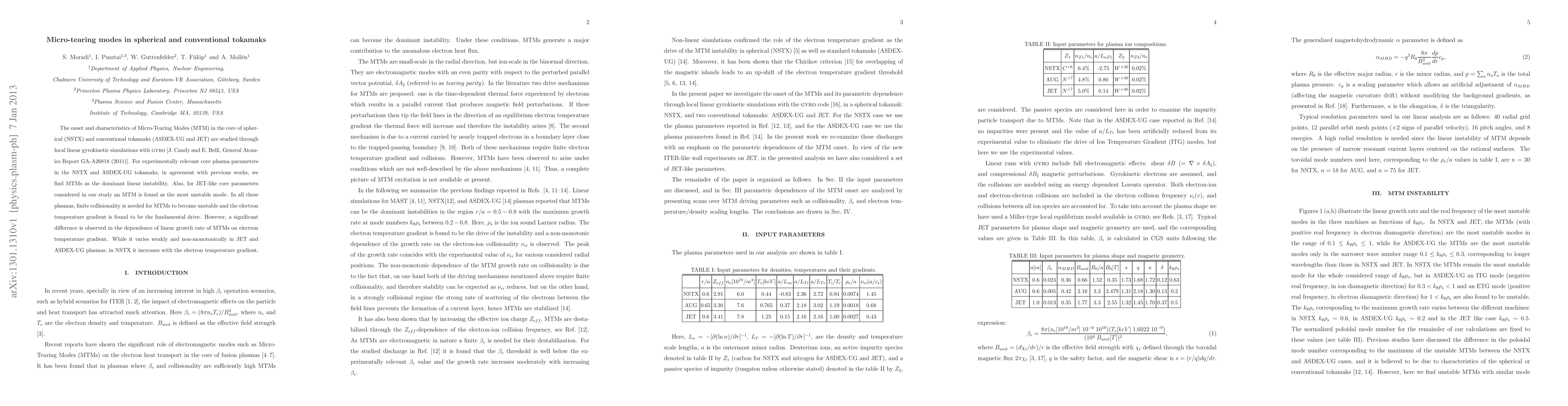 This paper investigates the onset and characteristics of Micro-Tearing Modes (MTM) in spherical and conventional tokamaks using local linear gyrokinetic simulations. It finds MTMs as the dominant instability in NSTX, ASDEX-UG, and JET tokamaks, with finite collisionality and electron temperature gradient driving the instability, though the growth rate's dependence on the electron temperature gradient varies across different tokamaks.