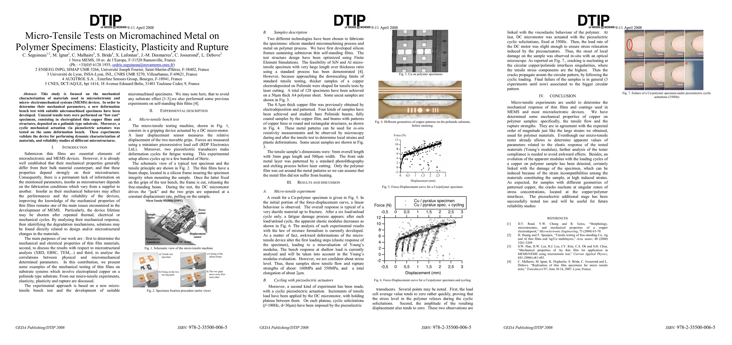 This study characterizes the mechanical properties of electroplated copper on a polyimide substrate using micro-tensile tests, validating a new deformation bench for dynamic material characterization and reliability studies in MEMS devices. Cyclic mechanical actuation via piezoelectric actuators further enhances the device's capability for dynamic analysis.