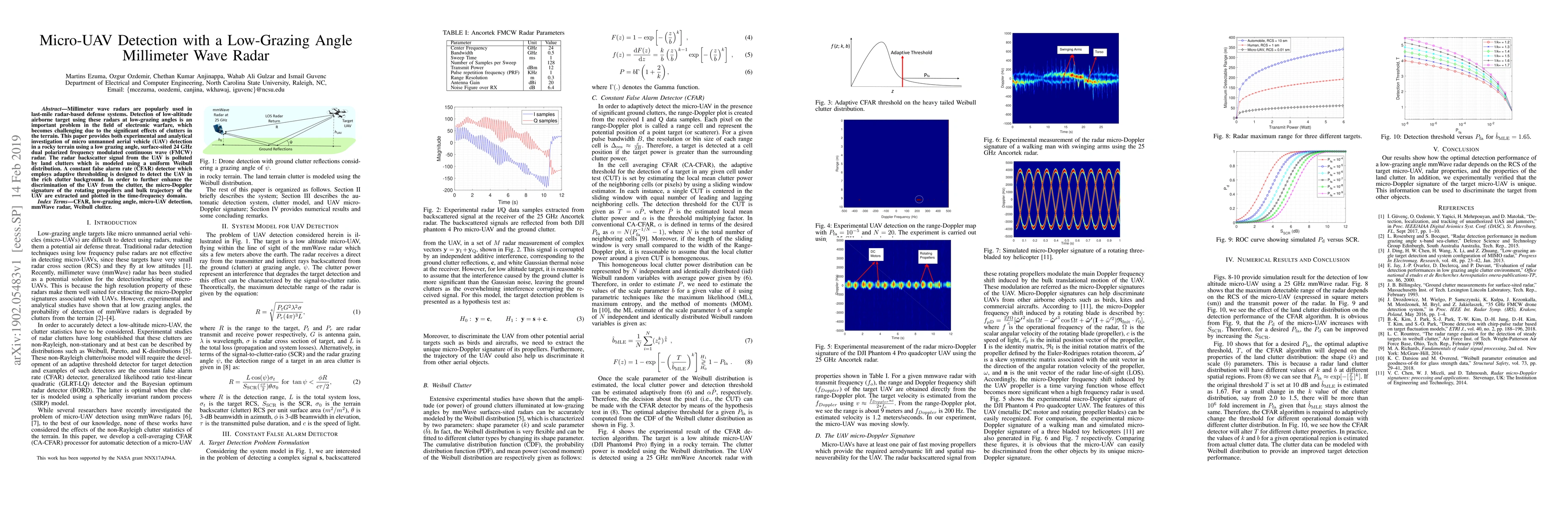 Millimeter wave radars are popularly used in last-mile radar-based defense systems. Detection of low-altitude airborne target using these radars at low-grazing angles is an important problem in the field of electronic warfare, which becomes challenging due to the significant effects of clutters in the terrain. This paper provides both experimental and analytical investigation of micro unmanned aerial vehicle (UAV) detection in a rocky terrain using a low grazing angle, surface-sited 24 GHz dual polarized frequency modulated continuous wave (FMCW) radar. The radar backscatter signal from the UAV is polluted by land clutters which is modeled using a uniform Weibull distribution. A constant false alarm rate (CFAR) detector which employs adaptive thresholding is designed to detect the UAV in the rich clutter background. In order to further enhance the discrimination of the UAV from the clutter, the micro-Doppler signature of the rotating propellers and bulk trajectory of the UAV are extracted and plotted in the time-frequency domain.