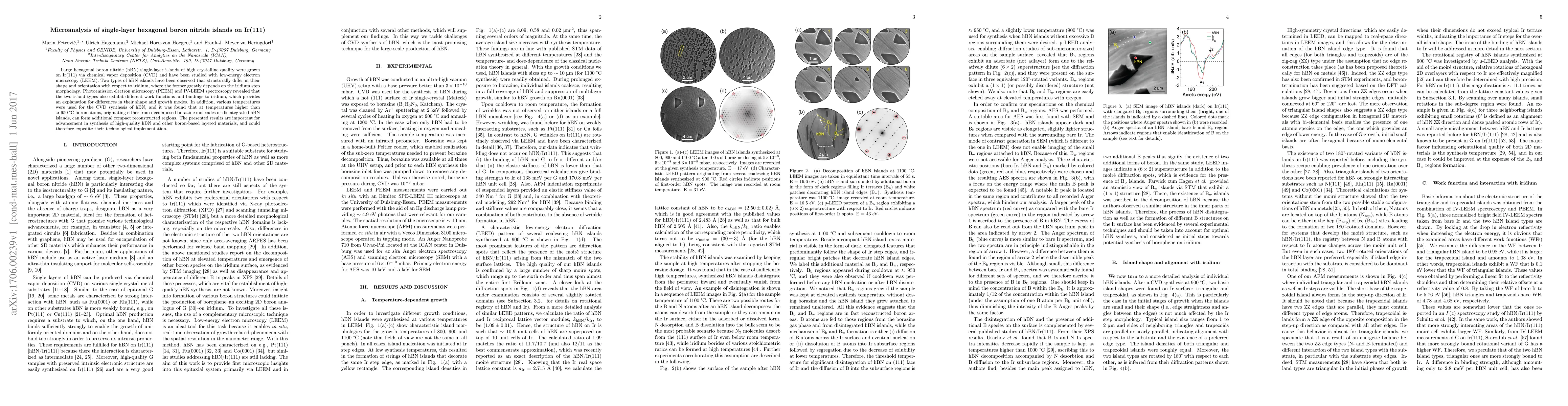 This study details the growth and characterization of high-quality hexagonal boron nitride (hBN) islands on Ir(111) via chemical vapor deposition, revealing two structurally distinct island types with different work functions and growth modes influenced by iridium step morphology. The research also identifies conditions for forming compact reconstructed boron regions, advancing the synthesis of high-quality hBN and similar materials for technology.