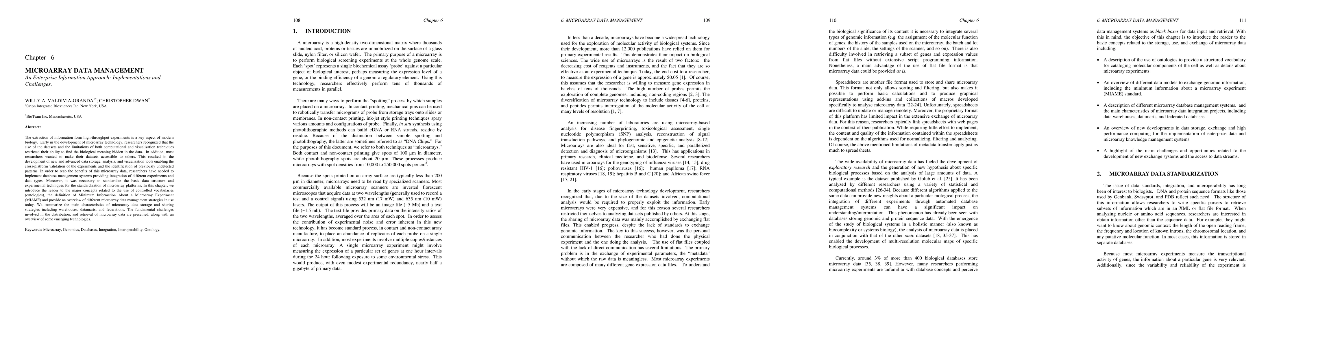This paper explores the management of microarray data through advanced storage, analysis, and visualization tools, emphasizing the need for standardized data structures and integration strategies. It highlights challenges in data distribution and retrieval, and introduces concepts like MIAME and various data management systems.