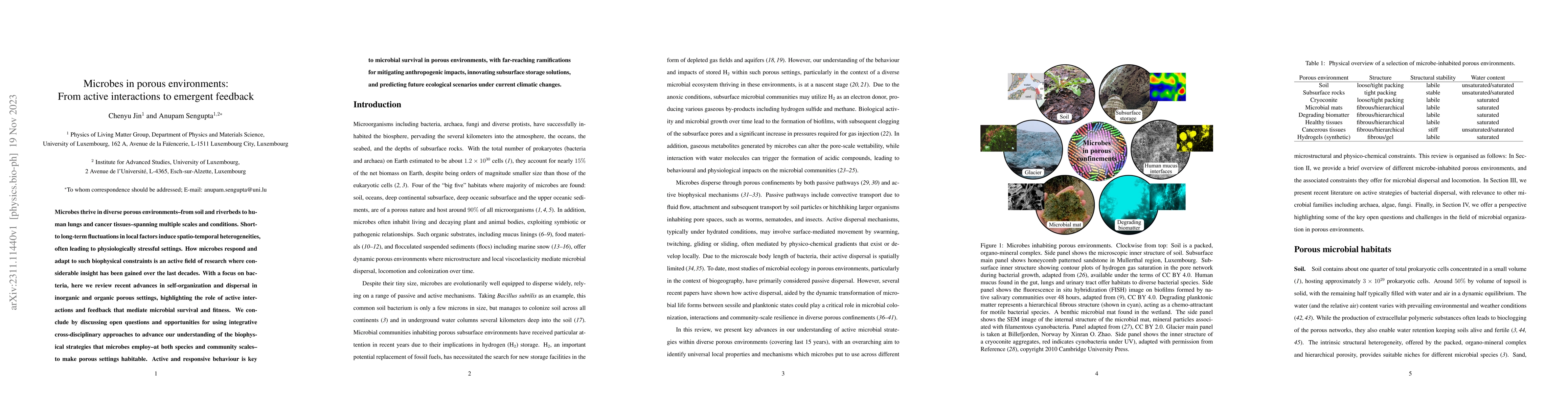 This paper reviews recent advances in understanding how bacteria adapt and survive in diverse porous environments through active interactions and feedback mechanisms, emphasizing the importance of these biophysical strategies for ecological and technological applications. Key open questions focus on leveraging cross-disciplinary approaches to further explore microbial self-organization and its implications for climate change and resource management.