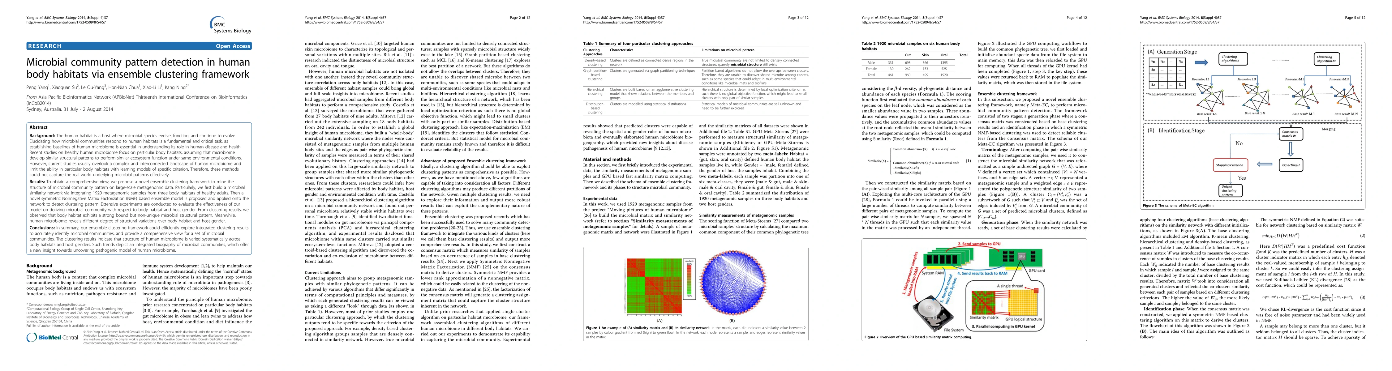 This paper proposes an ensemble clustering framework to analyze microbial community patterns in human body habitats using large-scale metagenomic data. The study constructs a microbial similarity network from 1920 samples and applies a symmetric Nonnegative Matrix Factorization-based ensemble model to detect microbial clustering patterns, revealing distinct microbial community structures influenced by body habitat and host gender.