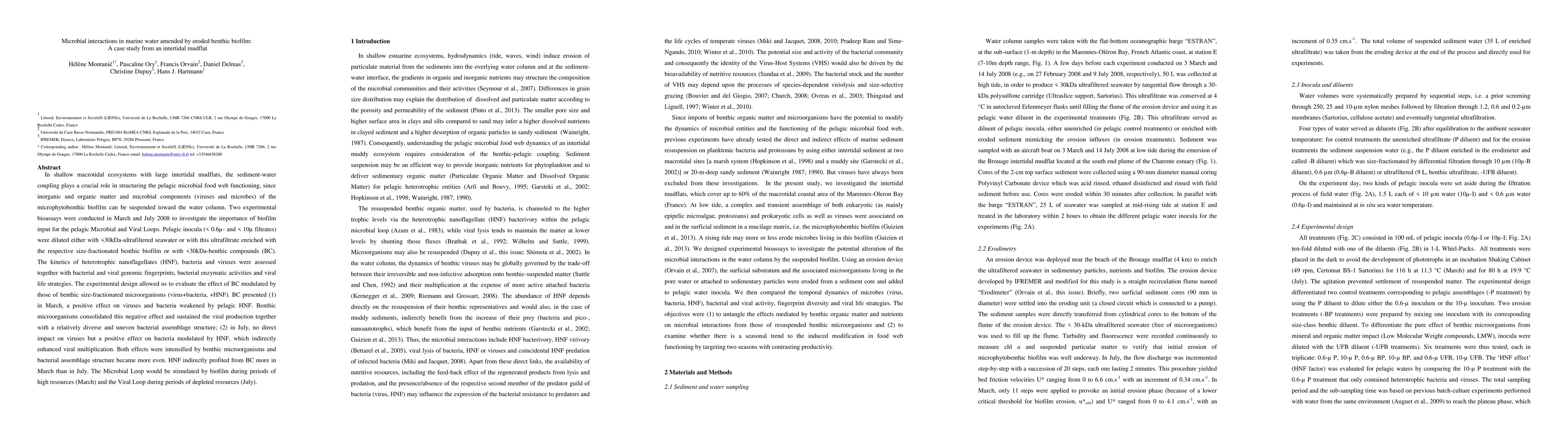 This study investigates the impact of eroded benthic biofilm on marine microbial interactions in intertidal mudflats, revealing that biofilm enhances bacterial and viral populations differently depending on the season, with a stronger effect on the Microbial Loop in March and the Viral Loop in July.