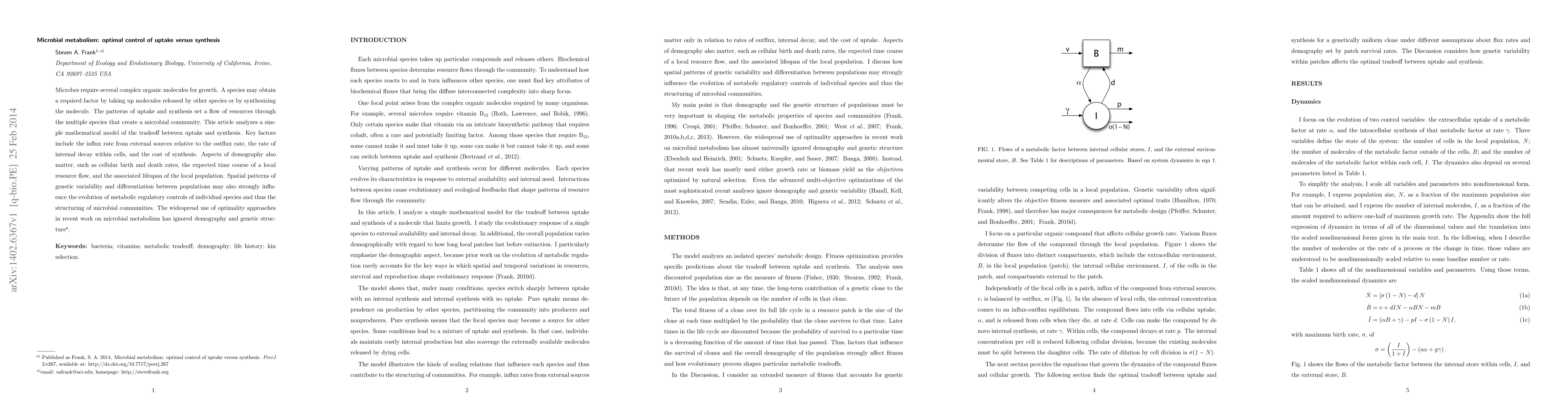 Microbes require several complex organic molecules for growth. A species may obtain a required factor by taking up molecules released by other species or by synthesizing the molecule. The patterns of uptake and synthesis set a flow of resources through the multiple species that create a microbial community. This article analyzes a simple mathematical model of the tradeoff between uptake and synthesis. Key factors include the influx rate from external sources relative to the outflux rate, the rate of internal decay within cells, and the cost of synthesis. Aspects of demography also matter, such as cellular birth and death rates, the expected time course of a local resource flow, and the associated lifespan of the local population. Spatial patterns of genetic variability and differentiation between populations may also strongly influence the evolution of metabolic regulatory controls of individual species and thus the structuring of microbial communities. The widespread use of optimality approaches in recent work on microbial metabolism has ignored demography and genetic structure.