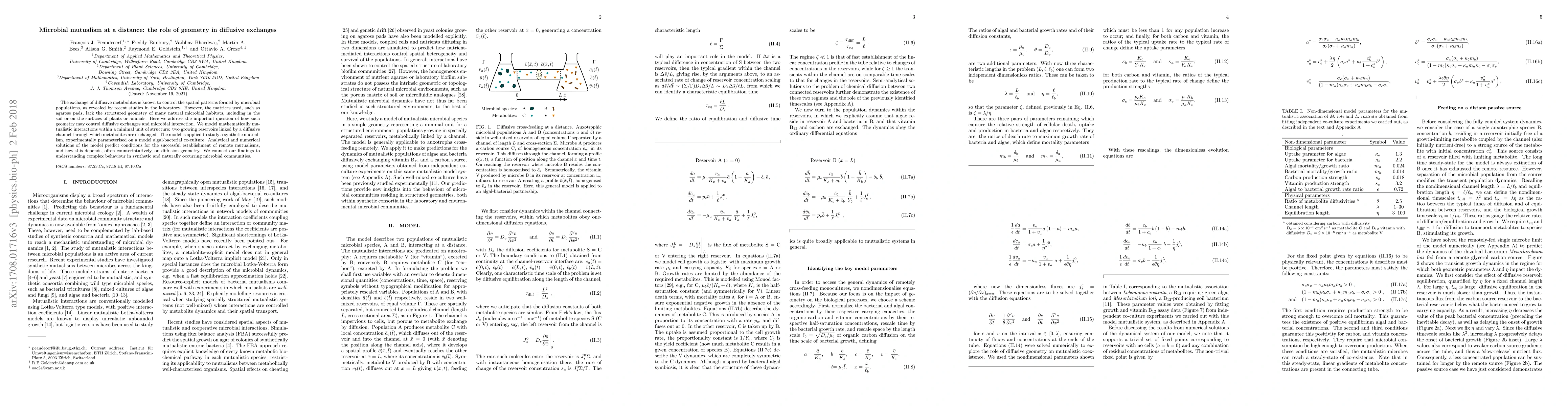 The exchange of diffusive metabolites is known to control the spatial patterns formed by microbial populations, as revealed by recent studies in the laboratory. However, the matrices used, such as agarose pads, lack the structured geometry of many natural microbial habitats, including in the soil or on the surfaces of plants or animals. Here we address the important question of how such geometry may control diffusive exchanges and microbial interaction. We model mathematically mutualistic interactions within a minimal unit of structure: two growing reservoirs linked by a diffusive channel through which metabolites are exchanged. The model is applied to study a synthetic mutualism, experimentally parameterised on a model algal-bacterial co-culture. Analytical and numerical solutions of the model predict conditions for the successful establishment of remote mutualisms, and how this depends, often counterintutively, on diffusion geometry. We connect our findings to understanding complex behaviour in synthetic and naturally occurring microbial communities.