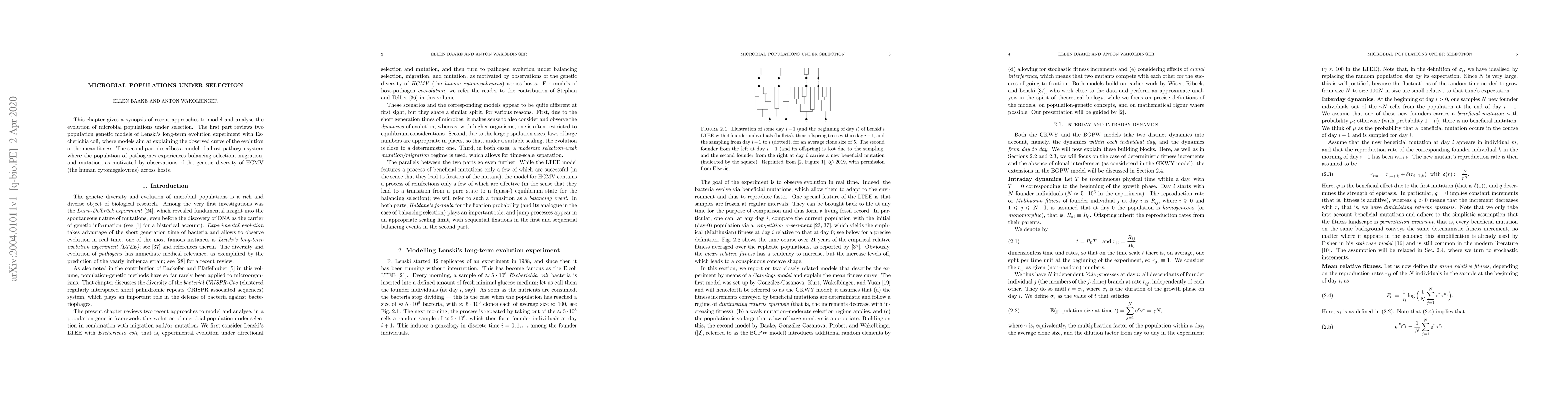 This paper reviews two population genetic models explaining the evolution of microbial populations under selection, focusing on Lenski's long-term evolution experiment with Escherichia coli, and describes a model for a host-pathogen system involving HCMV, incorporating balancing selection, migration, and mutation.