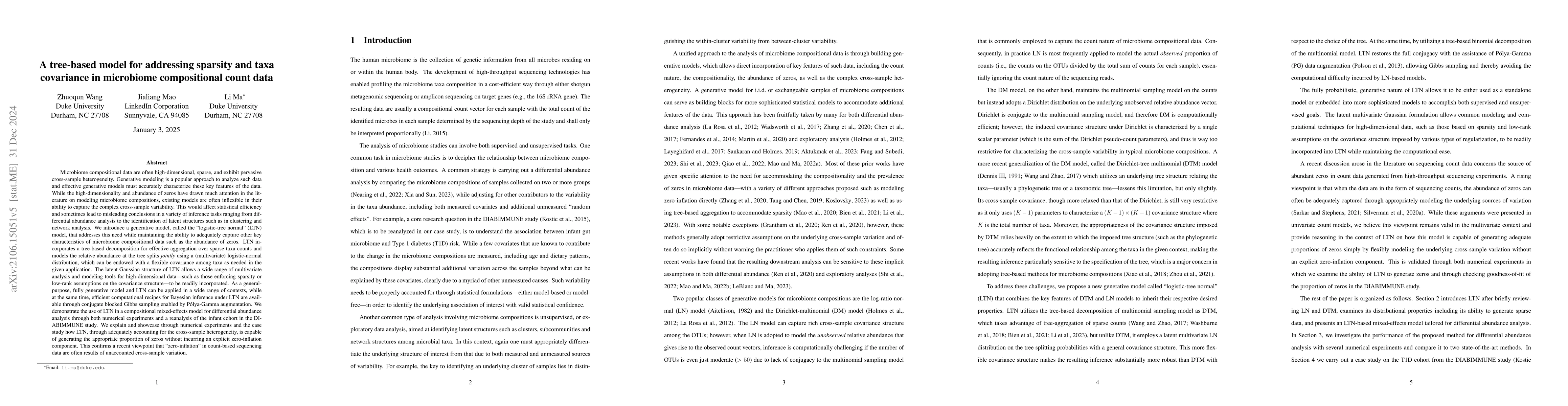 This paper introduces the logistic-tree normal (LTN) model to analyze high-dimensional microbiome compositional data, addressing dependency and computational scalability issues. The LTN model combines the benefits of log-ratio normal and Dirichlet-tree models, enabling rich covariance structures and efficient Bayesian inference via Gibbs sampling.