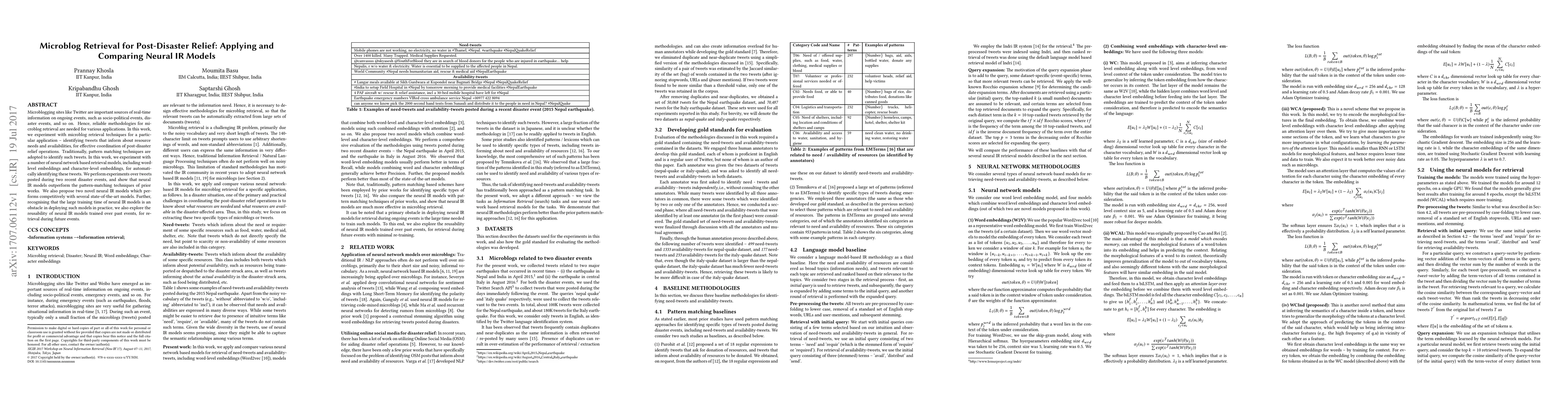 Microblogging sites like Twitter and Weibo have emerged as important sourcesof real-time information on ongoing events, including socio-political events, emergency events, and so on. For instance, during emergency events (such as earthquakes, floods, terror attacks), microblogging sites are very useful for gathering situational information in real-time. During such an event, typically only a small fraction of the microblogs (tweets) posted are relevant to the information need. Hence, it is necessary to design effective methodologies for microblog retrieval, so that the relevant tweets can be automatically extracted from large sets of documents (tweets). In this work, we apply and compare various neural network-based IR models for microblog retrieval for a specific application, as follows. In a disaster situation, one of the primary and practical challenges in coordinating the post-disaster relief operations is to know about what resources are needed and what resources are available in the disaster-affected area. Thus, in this study, we focus on extracting these two specific types of microblogs or tweets namely need tweets and avail tweets, which are tweets which define some needs of the people and the tweets which offer some solutions or aid for the people, respectively.