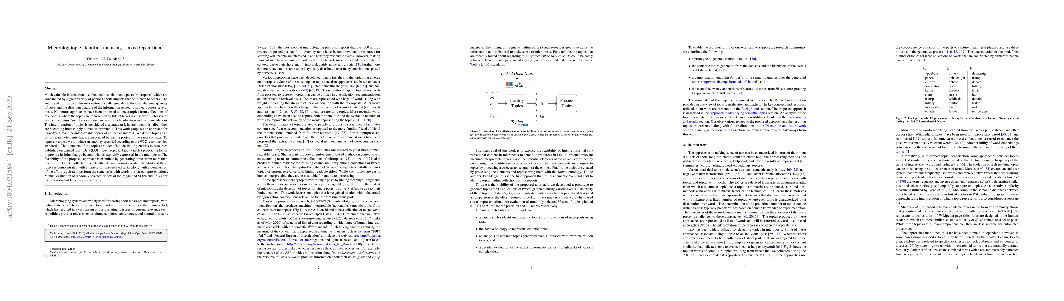 The extensive use of social media for sharing and obtaining information has resulted in the development of topic detection models to facilitate the comprehension of the overwhelming amount of short and distributed posts. Probabilistic topic models, such as Latent Dirichlet Allocation, and matrix factorization based approaches such as Latent Semantic Analysis and Non-negative Matrix Factorization represent topics as sets of terms that are useful for many automated processes. However, the determination of what a topic is about is left as a further task. Alternatively, techniques that produce summaries are human comprehensible, but less suitable for automated processing. This work proposes an approach that utilizes Linked Open Data (LOD) resources to extract semantically represented topics from collections of microposts. The proposed approach utilizes entity linking to identify the elements of topics from microposts. The elements are related through co-occurrence graphs, which are processed to yield topics. The topics are represented using an ontology that is introduced for this purpose. A prototype of the approach is used to identify topics from 11 datasets consisting of more than one million posts collected from Twitter during various events, such as the 2016 US election debates and the death of Carrie Fisher. The characteristics of the approach with more than 5 thousand generated topics are described in detail. The potentials of semantic topics in revealing information, that is not otherwise easily observable, is demonstrated with semantic queries of various complexities. A human evaluation of topics from 36 randomly selected intervals resulted in a precision of 81.0% and F1 score of 93.3%. Furthermore, they are compared with topics generated from the same datasets from an approach that produces human readable topics from microblog post collections.
