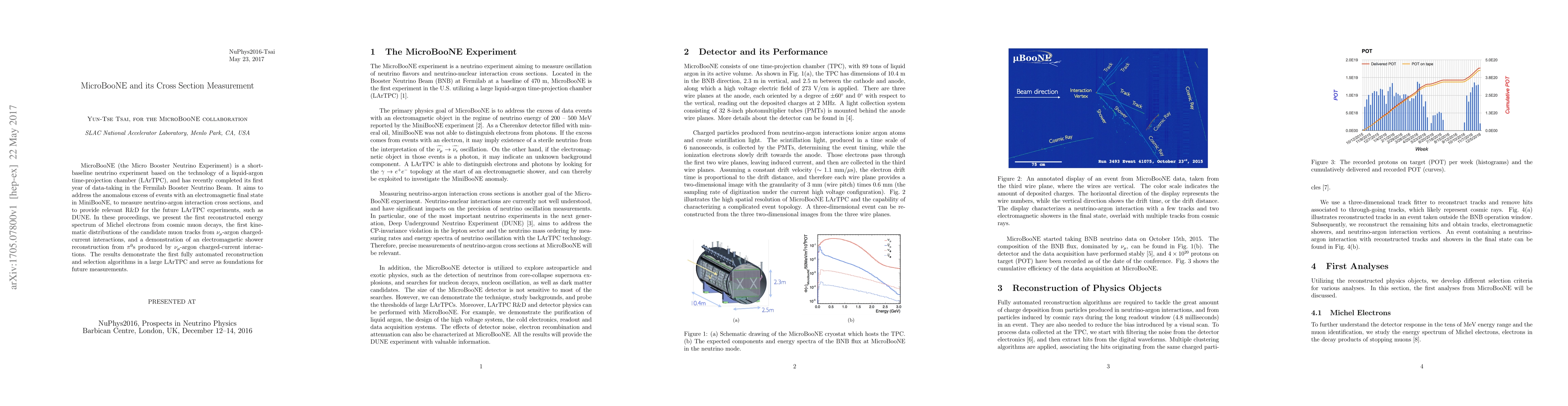 MicroBooNE (the Micro Booster Neutrino Experiment) is a short-baseline neutrino experiment based on the technology of a liquid-argon time-projection chamber (LArTPC), and has recently completed its first year of data-taking in the Fermilab Booster Neutrino Beam. It aims to address the anomalous excess of events with an electromagnetic final state in MiniBooNE, to measure neutrino-argon interaction cross sections, and to provide relevant R\&D for the future LArTPC experiments, such as DUNE. In these proceedings, we present the first reconstructed energy spectrum of Michel electrons from cosmic muon decays, the first kinematic distributions of the candidate muon tracks from $\nu_{\mu}$-argon charged-current interactions, and a demonstration of an electromagnetic shower reconstruction from $\pi^0$s produced by $\nu_{\mu}$-argon charged-current interactions. The results demonstrate the first fully automated reconstruction and selection algorithms in a large LArTPC and serve as foundations for future measurements.