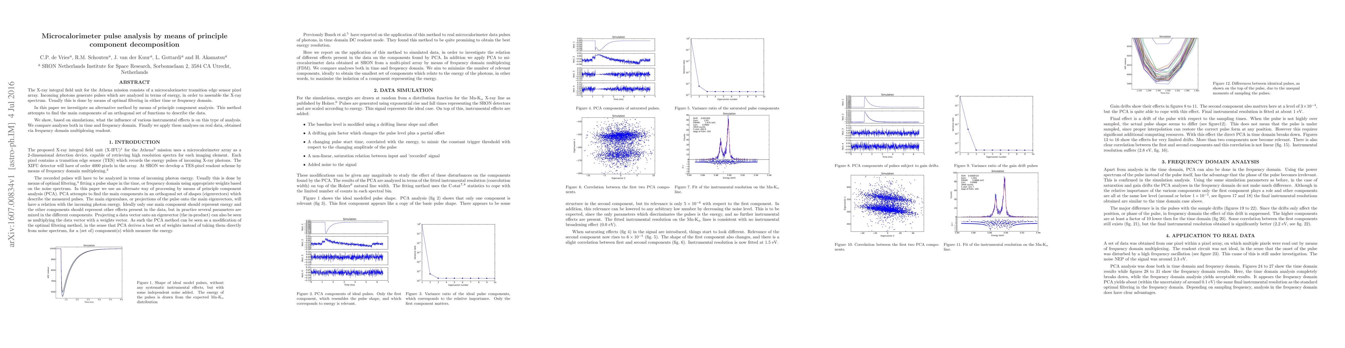 The X-ray integral field unit for the Athena mission consists of a microcalorimeter transition edge sensor pixel array. Incoming photons generate pulses which are analyzed in terms of energy, in order to assemble the X-ray spectrum. Usually this is done by means of optimal filtering in either time or frequency domain. In this paper we investigate an alternative method by means of principle component analysis. This method attempts to find the main components of an orthogonal set of functions to describe the data. We show, based on simulations, what the influence of various instrumental effects is on this type of analysis. We compare analyses both in time and frequency domain. Finally we apply these analyses on real data, obtained via frequency domain multiplexing readout.