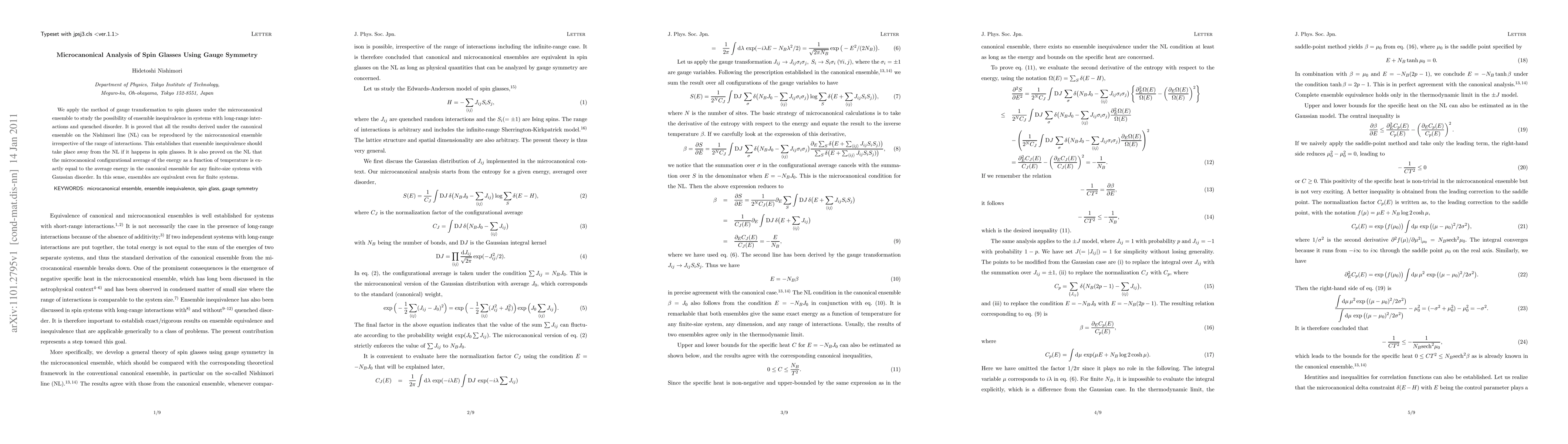 This paper uses gauge transformation in the microcanonical ensemble to explore ensemble inequivalence in spin glasses with long-range interactions and quenched disorder, proving that ensemble equivalence holds even for finite systems with Gaussian disorder. It concludes that ensemble inequivalence, if it occurs, must happen away from the Nishimori line.