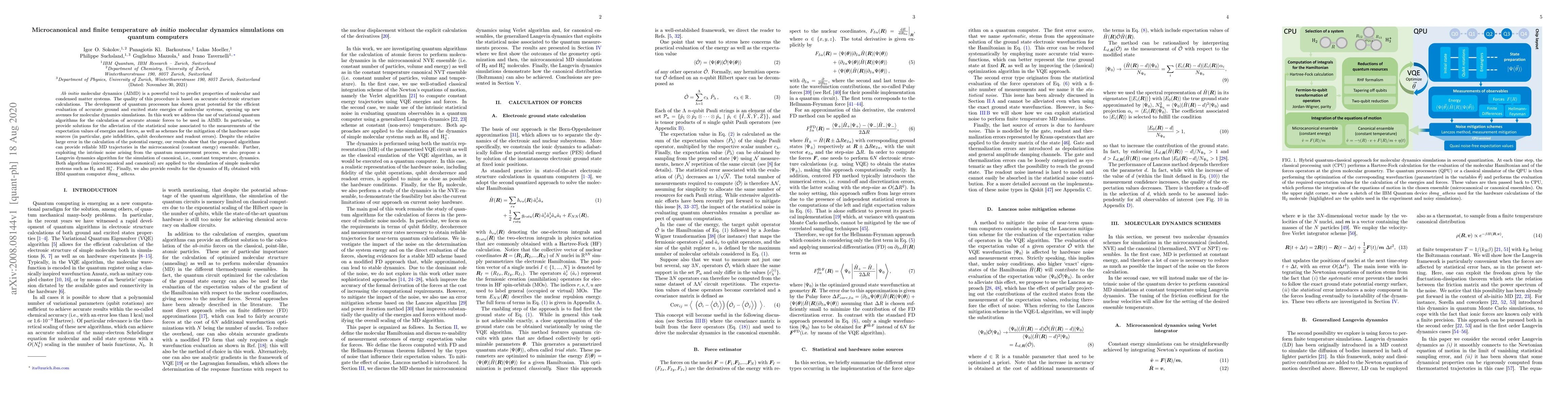 This paper explores the application of variational quantum algorithms for ab initio molecular dynamics (AIMD) simulations on quantum computers, addressing noise reduction techniques to improve accuracy. It proposes methods for both microcanonical and canonical ensemble simulations, demonstrating their effectiveness on simple molecular systems.