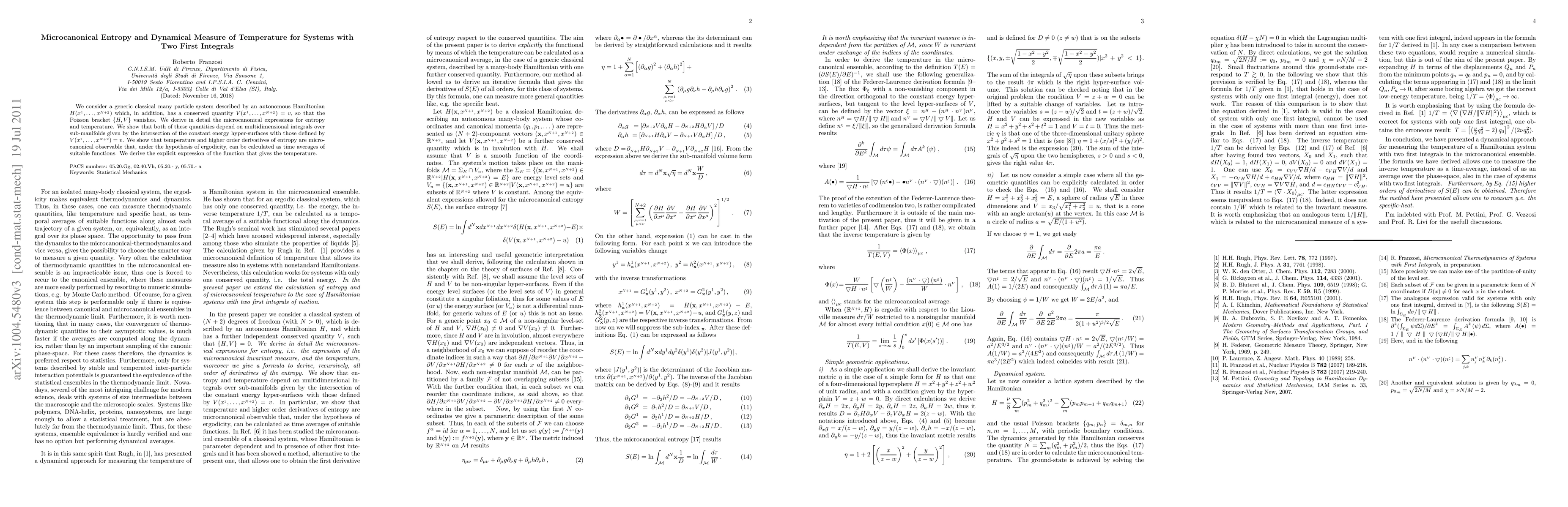 We consider a generic classical many particle system described by an autonomous Hamiltonian $H(x^{_1},...,x^{_{N+2}})$ which, in addition, has a conserved quantity $V(x^{_1},...,x^{_{N+2}})=v$, so that the Poisson bracket $\{H,V \}$ vanishes. We derive in detail the microcanonical expressions for entropy and temperature. We show that both of these quantities depend on multidimensional integrals over submanifolds given by the intersection of the constant energy hypersurfaces with those defined by $V(x^{_1},...,x^{_{N+2}})=v$. We show that temperature and higher order derivatives of entropy are microcanonical observable that, under the hypothesis of ergodicity, can be calculated as time averages of suitable functions. We derive the explicit expression of the function that gives the temperature.
