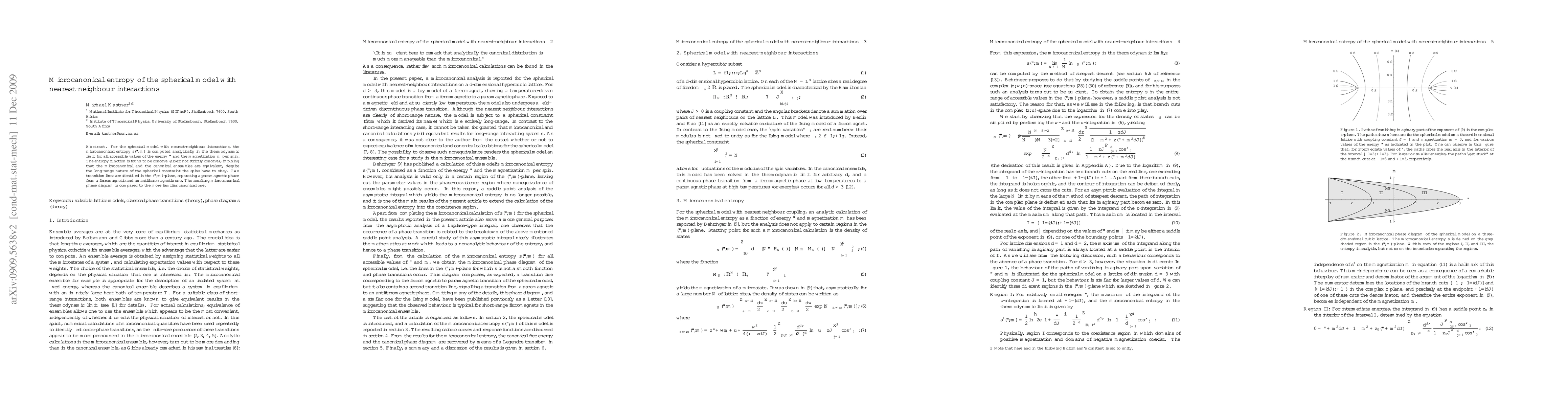 The paper analytically computes the microcanonical entropy of the spherical model with nearest-neighbour interactions, revealing concavity and equivalence between microcanonical and canonical ensembles. It identifies two transition lines in the (energy, magnetization) plane, delineating paramagnetic, ferromagnetic, and antiferromagnetic phases.