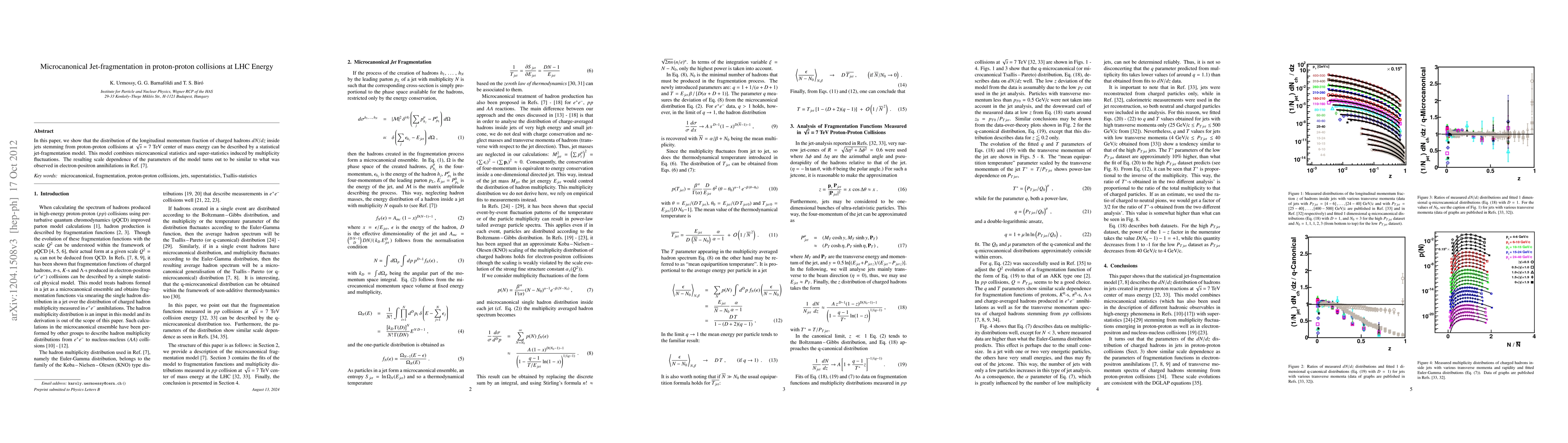 This paper demonstrates that the distribution of longitudinal momentum fraction in charged hadrons from proton-proton collisions at 7 TeV can be modeled using a statistical jet-fragmentation approach combining microcanonical statistics and super-statistics. The model's scale dependence mirrors observations in electron-positron annihilations.