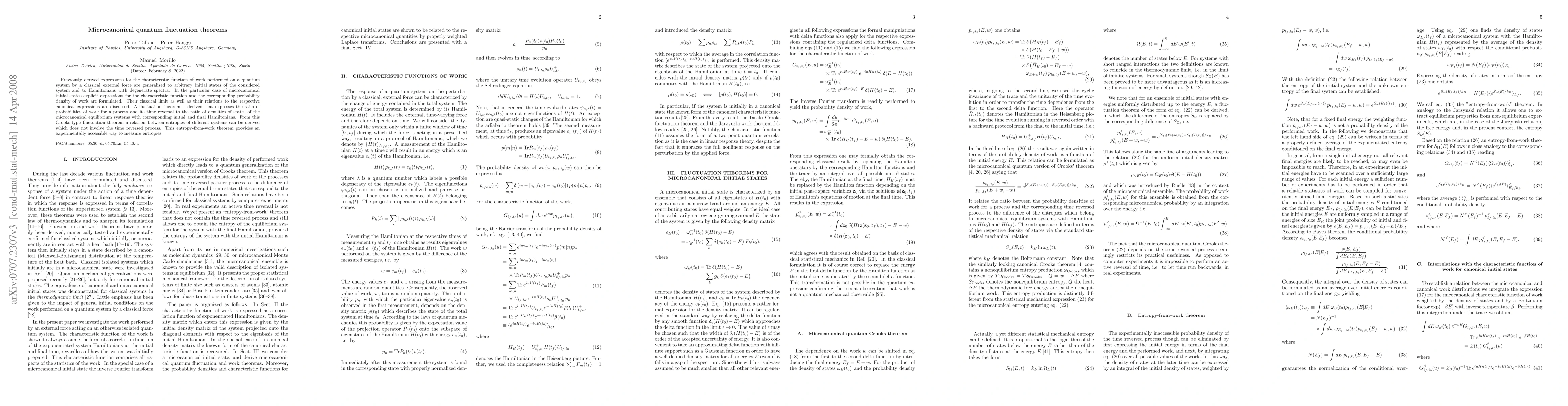 Previously derived expressions for the characteristic function of work performed on a quantum system by a classical external force are generalized to arbitrary initial states of the considered system and to Hamiltonians with degenerate spectra. In the particular case of microcanonical initial states explicit expressions for the characteristic function and the corresponding probability density of work are formulated. Their classical limit as well as their relations to the respective canonical expressions are discussed. A fluctuation theorem is derived that expresses the ratio of probabilities of work for a process and its time reversal to the ratio of densities of states of the microcanonical equilibrium systems with corresponding initial and final Hamiltonians.From this Crooks-type fluctuation theorem a relation between entropies of different systems can be derived which does not involve the time reversed process. This entropy-from-work theorem provides an experimentally accessible way to measure entropies.