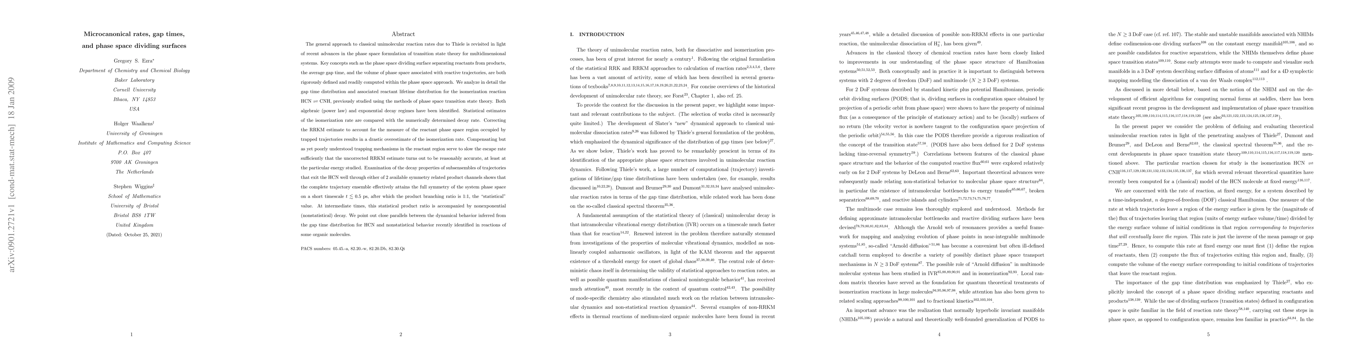 The general approach to classical unimolecular reaction rates due to Thiele is revisited in light of recent advances in the phase space formulation of transition state theory for multidimensional systems. We analyze in detail the gap time distribution and associated reactant lifetime distribution for the isomerization reaction HCN $\rightleftharpoons$ CNH. Both algebraic (power law) and exponential decay regimes have been identified. Statistical estimates of the isomerization rate are compared with the numerically determined decay rate. Examination of the decay properties of subsensembles of trajectories that exit the HCN well through either of 2 available symmetry related product channels shows that the complete trajectory ensemble effectively attains the full symmetry of the system phase space on a short timescale $t \lesssim 0.5$ ps, after which the product branching ratio is 1:1, the "statistical" value. At intermediate times, this statistical product ratio is accompanied by nonexponential (nonstatistical) decay. We point out close parallels between the dynamical behavior inferred from the gap time distribution for HCN and nonstatistical behavior recently identified in reactions of some organic molecules.