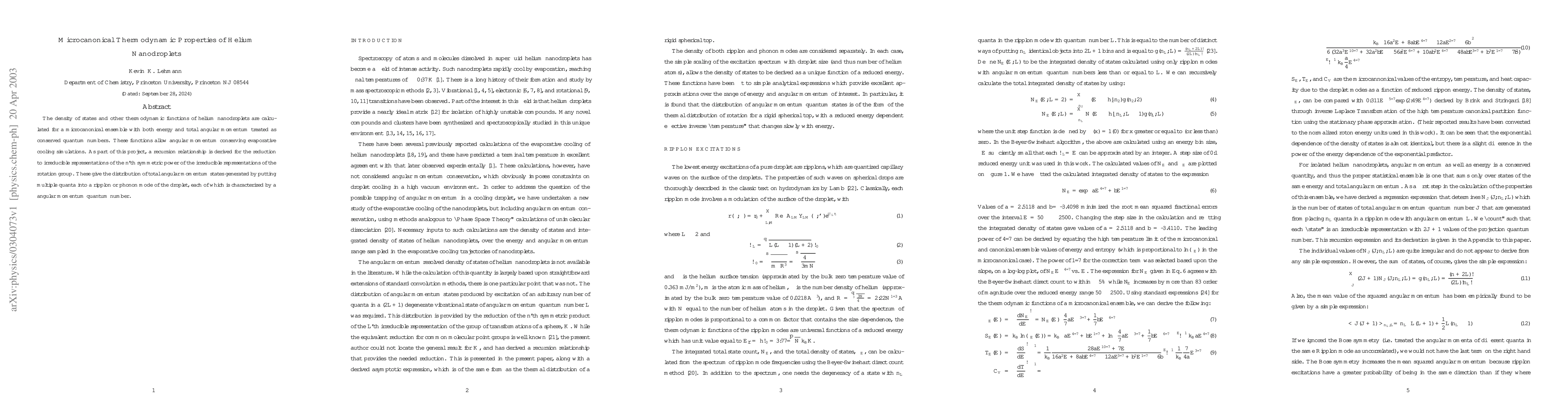 The research calculates the density of states and other thermodynamic functions for helium nanodroplets in a microcanonical ensemble, conserving energy and total angular momentum as quantum numbers, enabling angular momentum conserving evaporative cooling simulations.