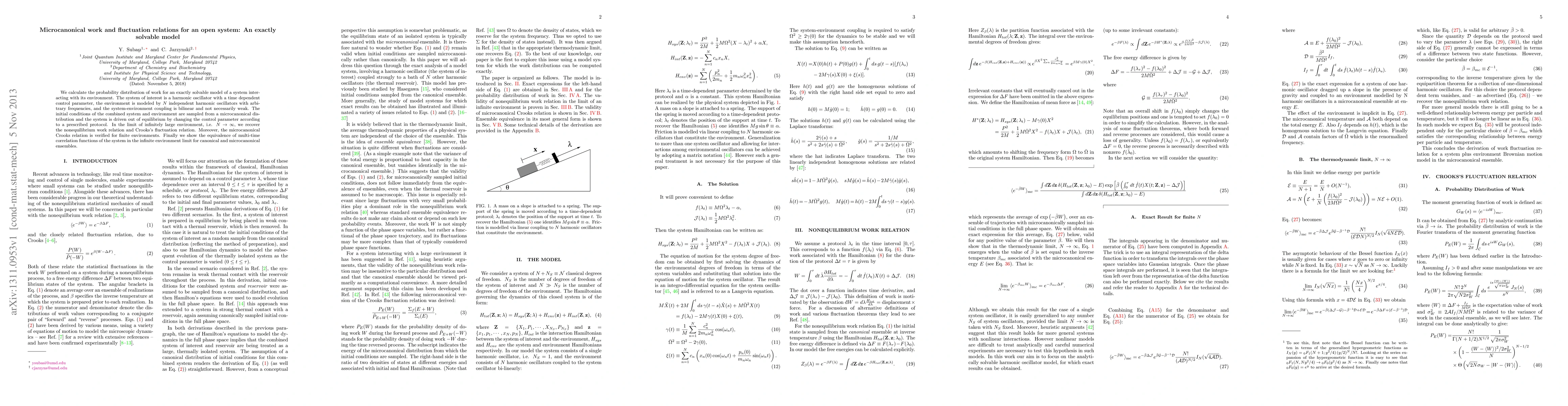This paper explores the probability distribution of work in an exactly solvable model of a harmonic oscillator interacting with a large environment of independent harmonic oscillators. It verifies fluctuation relations, including Crooks's relation, in both finite and infinite environment limits, and demonstrates equivalence between multi-time correlation functions in canonical and microcanonical ensembles for large environments.