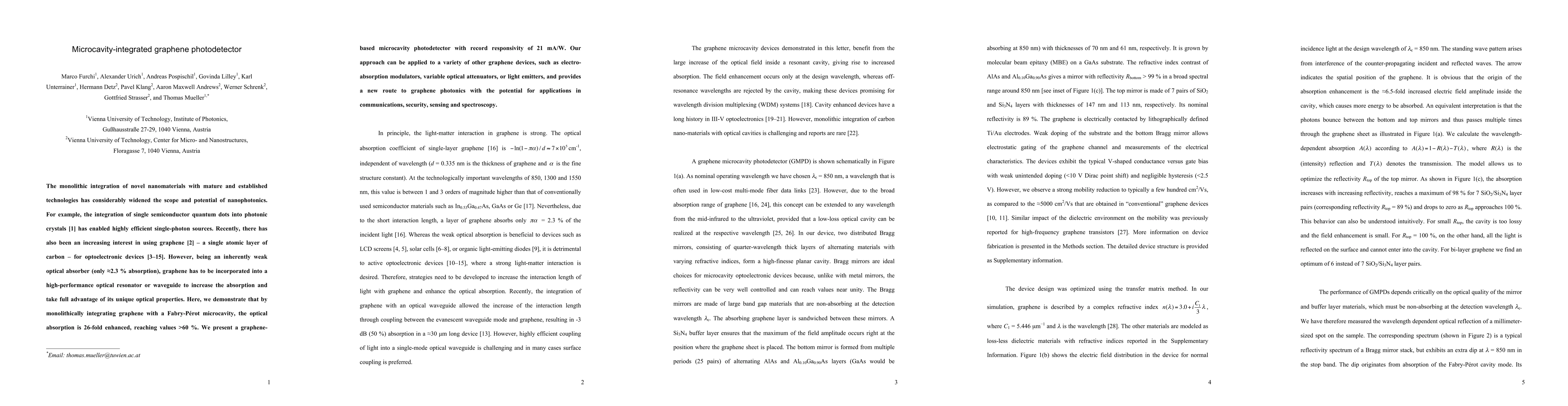 This paper demonstrates the integration of graphene with a Fabry-Perot microcavity to enhance optical absorption by 26-fold, achieving over 60% absorption. The resulting graphene-based microcavity photodetector sets a record with a responsivity of 21 mA/W, opening new avenues for graphene photonics applications in communications, security, sensing, and spectroscopy.